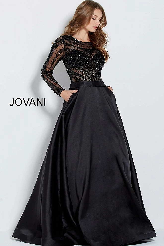 Jovani 46066 Sheer embellished high neckline evening gown with sheer embellished long sleeves and sheer embellished closed back. This long A line prom dress has pockets in the mikado skirt.Â
