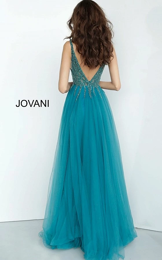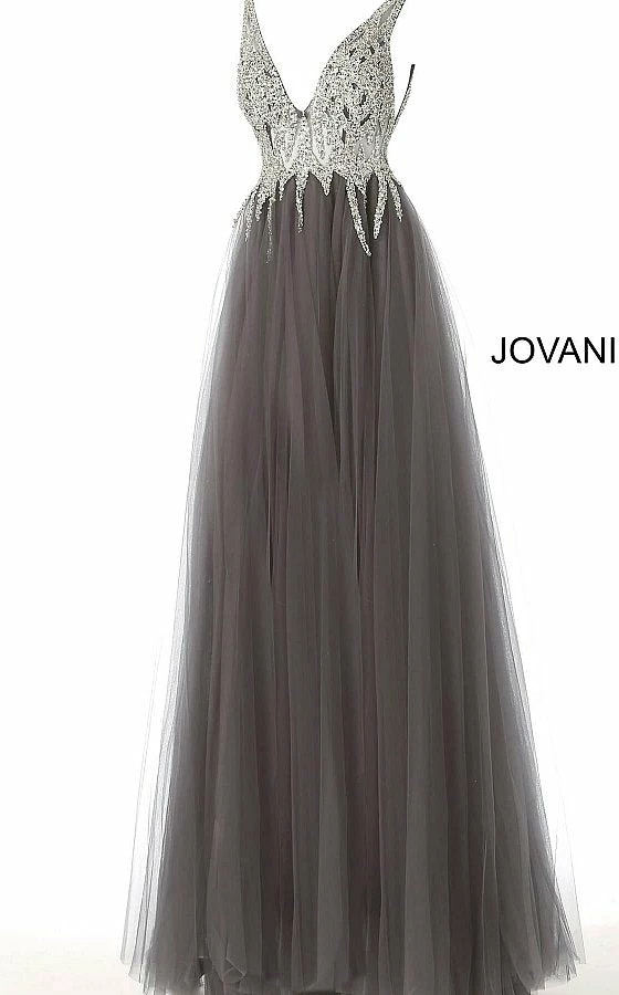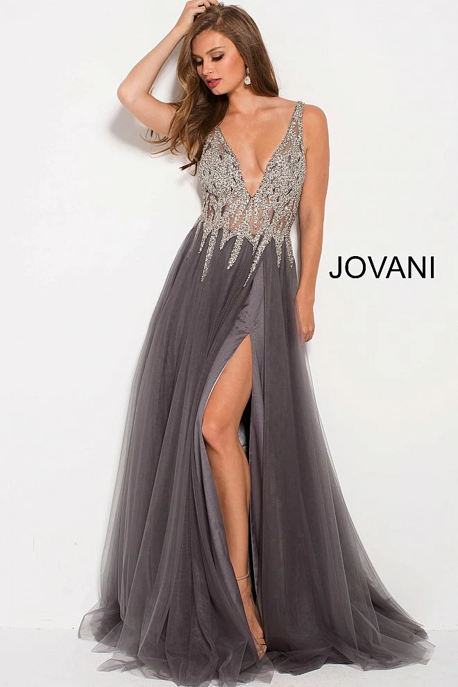 - Details: Embellished sheer bodice, sleeveless, plunging V neck, v back, tulle skirt, high slit, sweeping train.