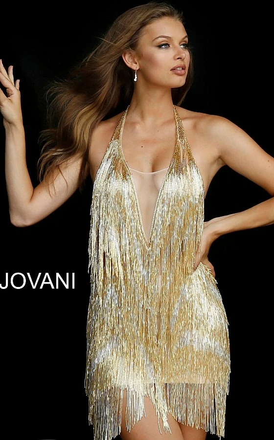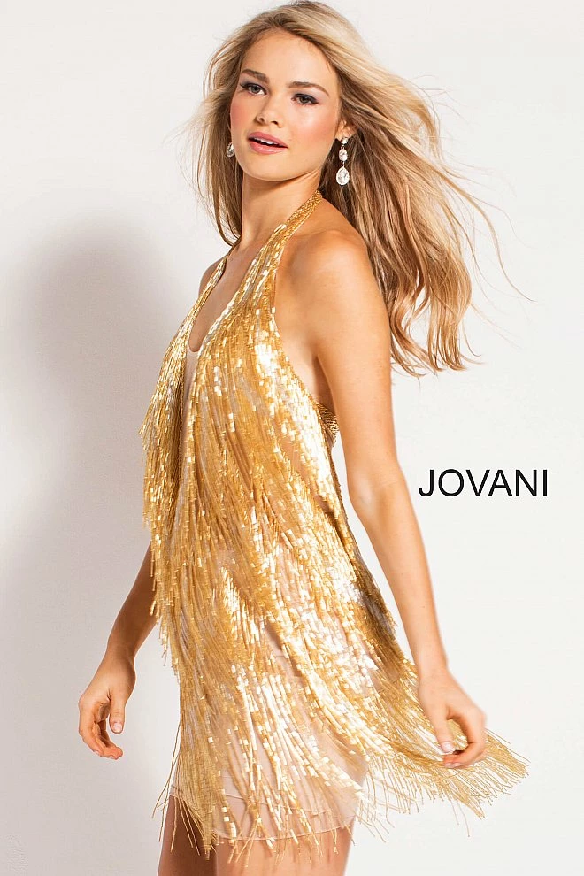 Jovani 57907 Embellished Fringe Backless Short Dress 57907
