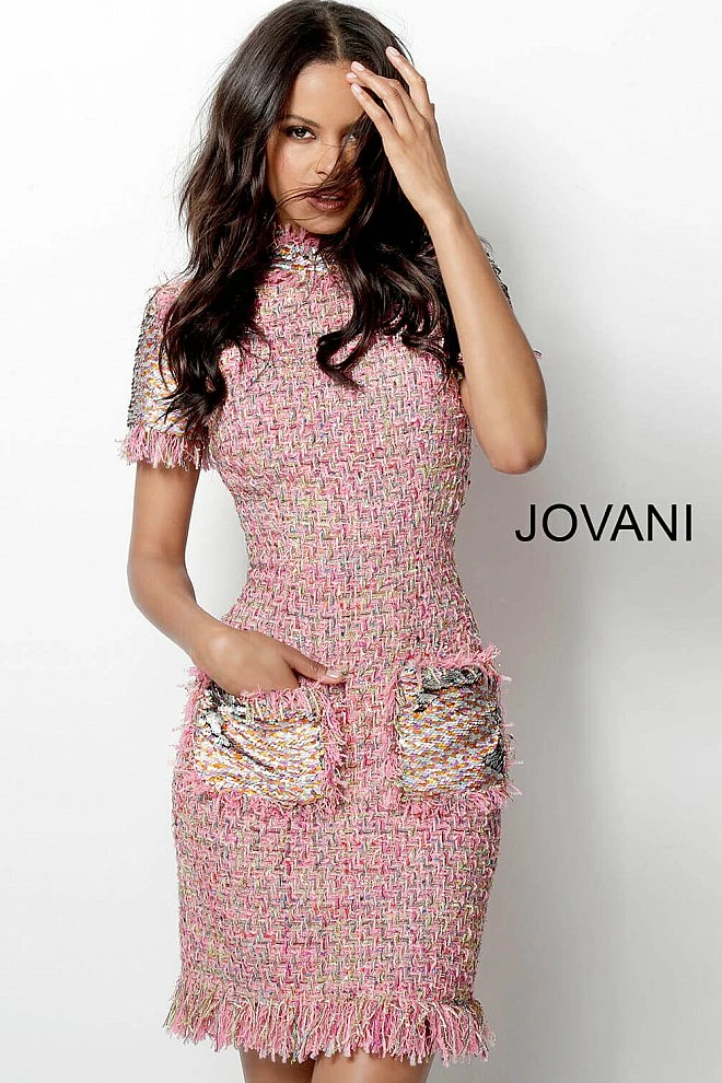 Jovani 63219 Short form fitting pink multi knit cocktail dress with two front pockets features short sleeve bodice with high neckline and close back. Formal and Semi Formal Dress, Party Dress, Cocktail Dress