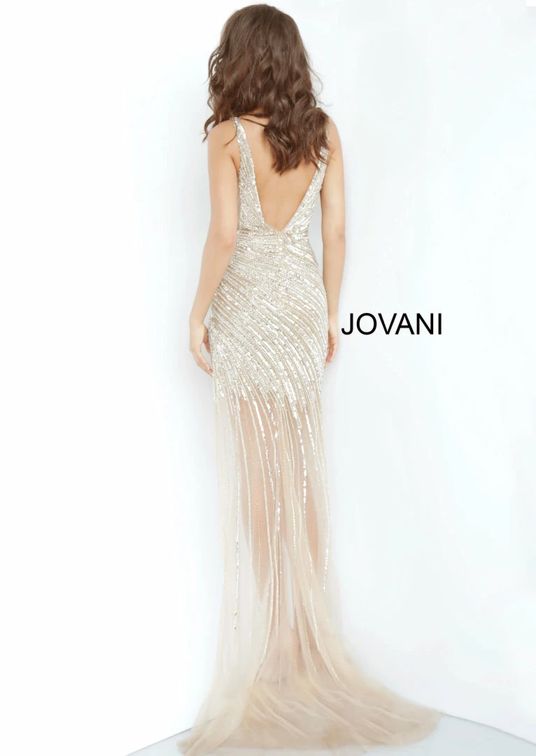 Details: Gold and silver fully beaded long prom dress with low v-neckline, sleeveless fitted bodice, sheer side panels and v-back, floor length fitted sheer skirt with high open side slit.