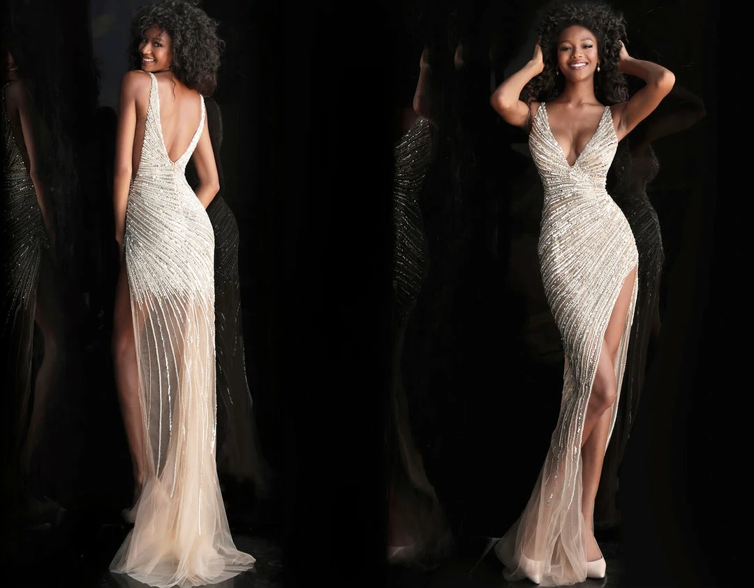 Jovani 63405 Fully Embellished Formal Evening Gown. High Low Side slit will have you stealing the Red Carpet!Â