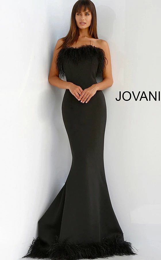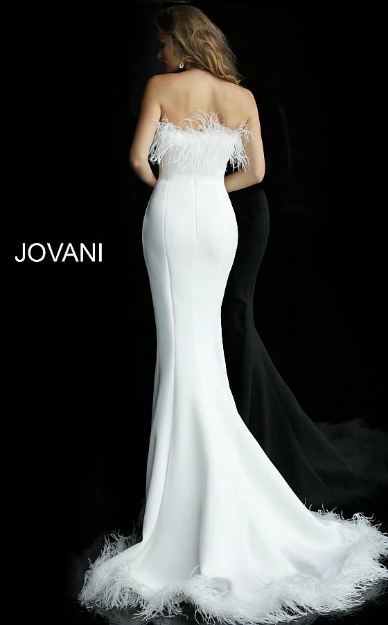 Jovani 63891 straight neckline with feather trim on the neckline and feather trim on the edge of the skirt with a sweeping train fitted mermaid evening gown wedding dress prom gown