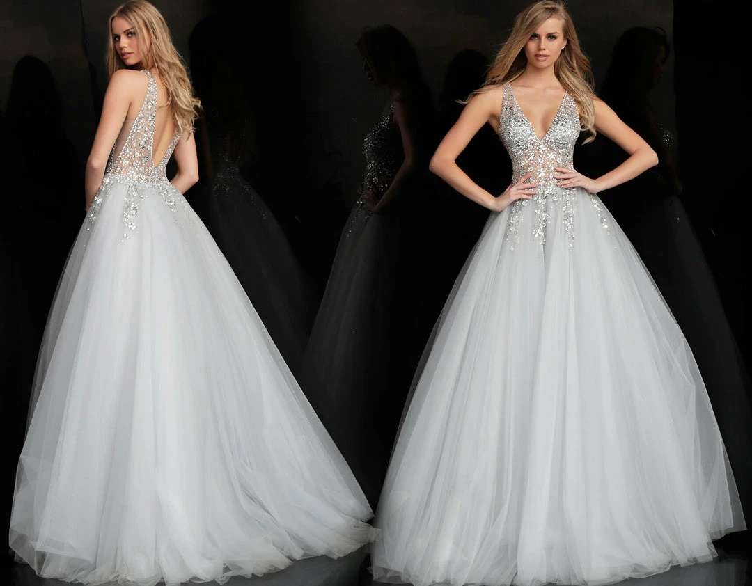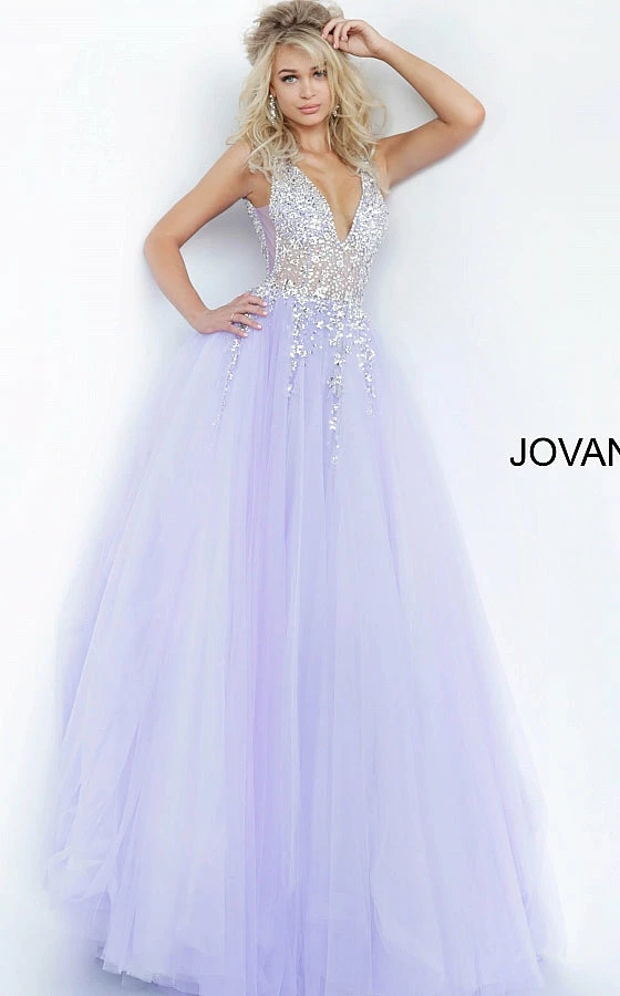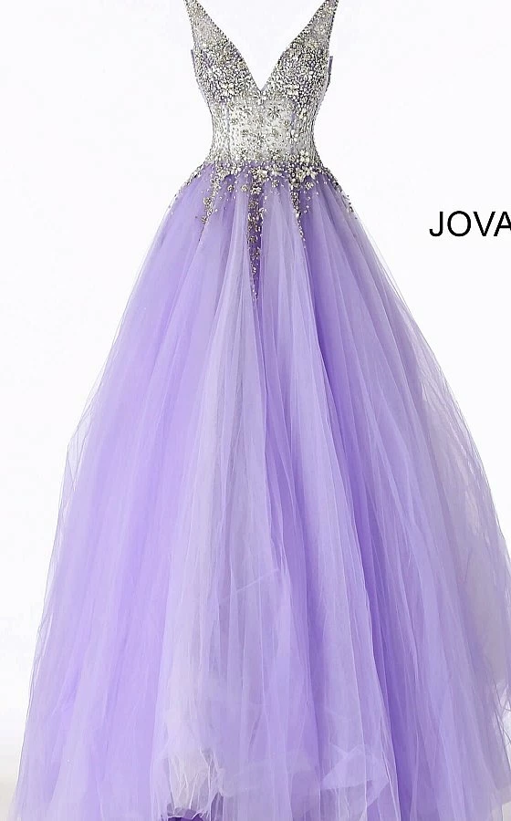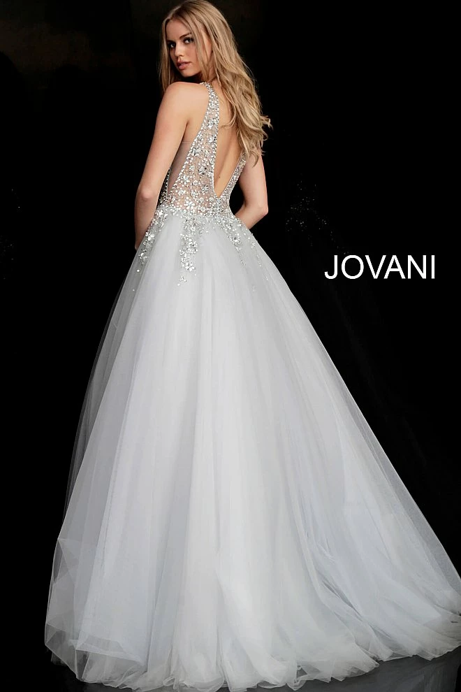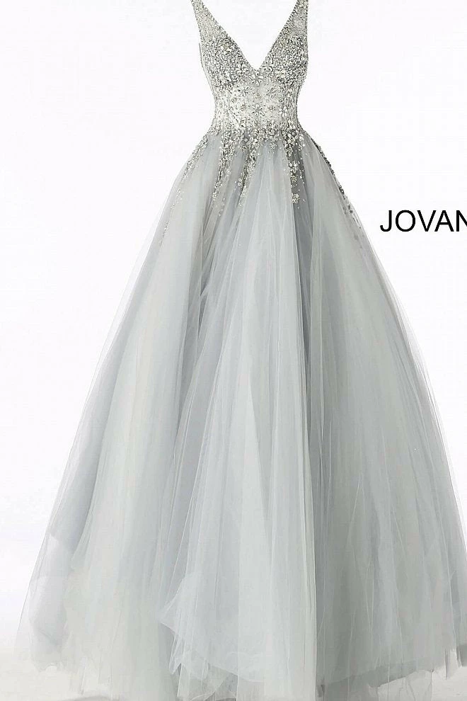 Jovani 65379 This Jovani ball gown has a crystal embellished bodice with a low v neckline. The tulle prom dress has a full skirt.