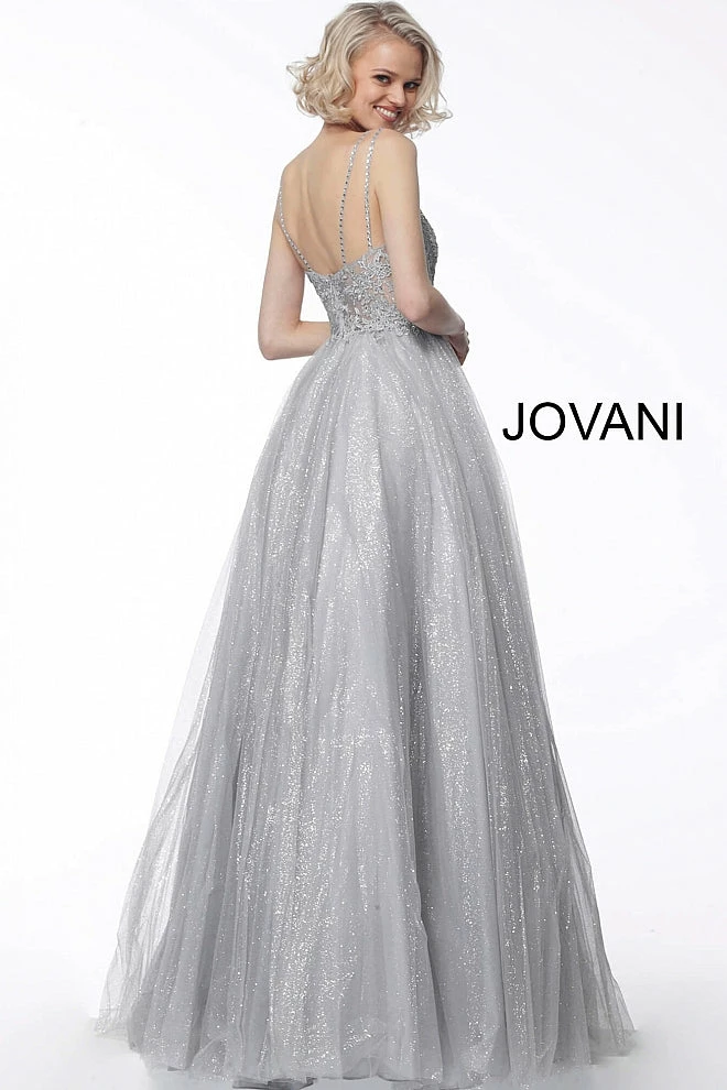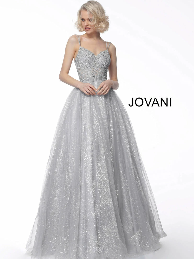 Jovani 67051 is a Long Prom Dress Ball Gown with Shimmer Tulle on the Full Skirt. Sheer Illusion Lace Embroidering on the bodice. V Neckline and spaghetti straps.Â