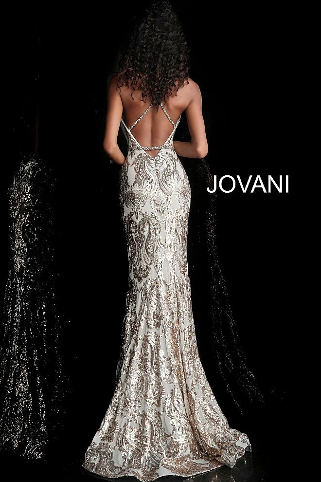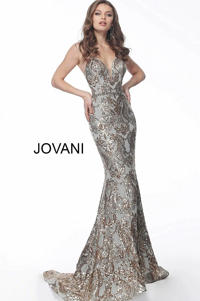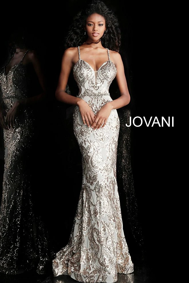 Jovani 67347 2020 Prom Dress, Pageant Gown Formal Evening Wear. This Gold/Silver plunging neckline embellished prom dress