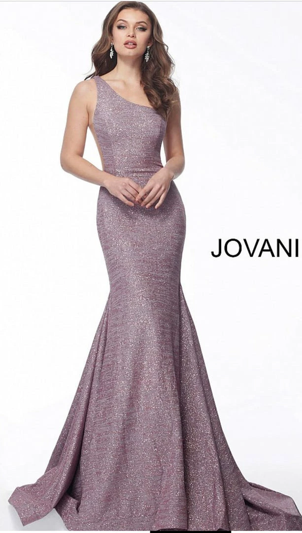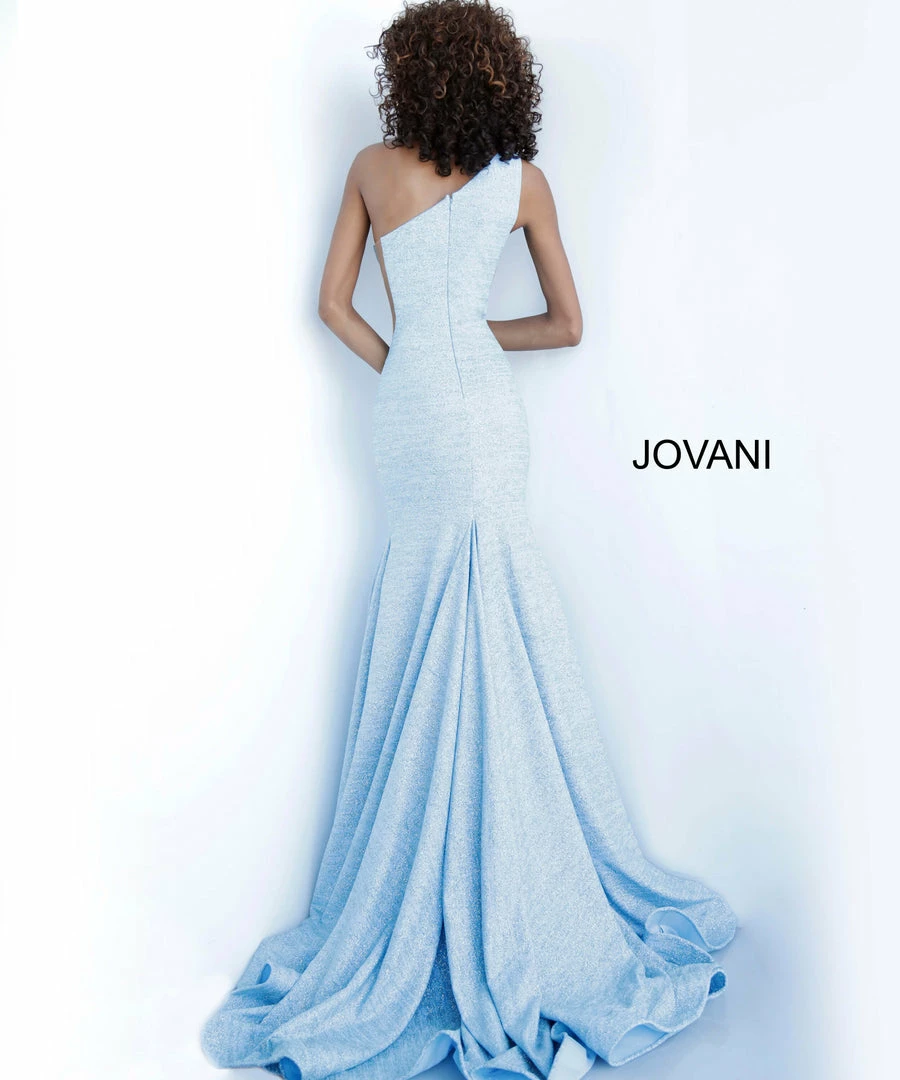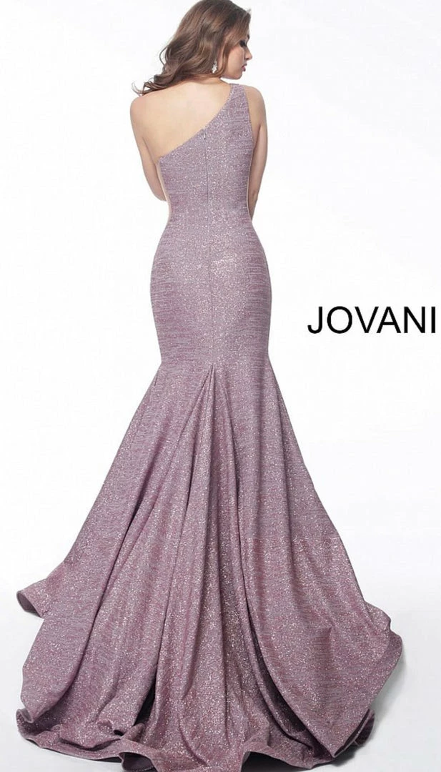Jovani 67650 stretch glitter bodycon prom dress with one shoulder sleeveless bodice and asymmetrical neckline, floor-length fitted skirt with a flared end and long train.