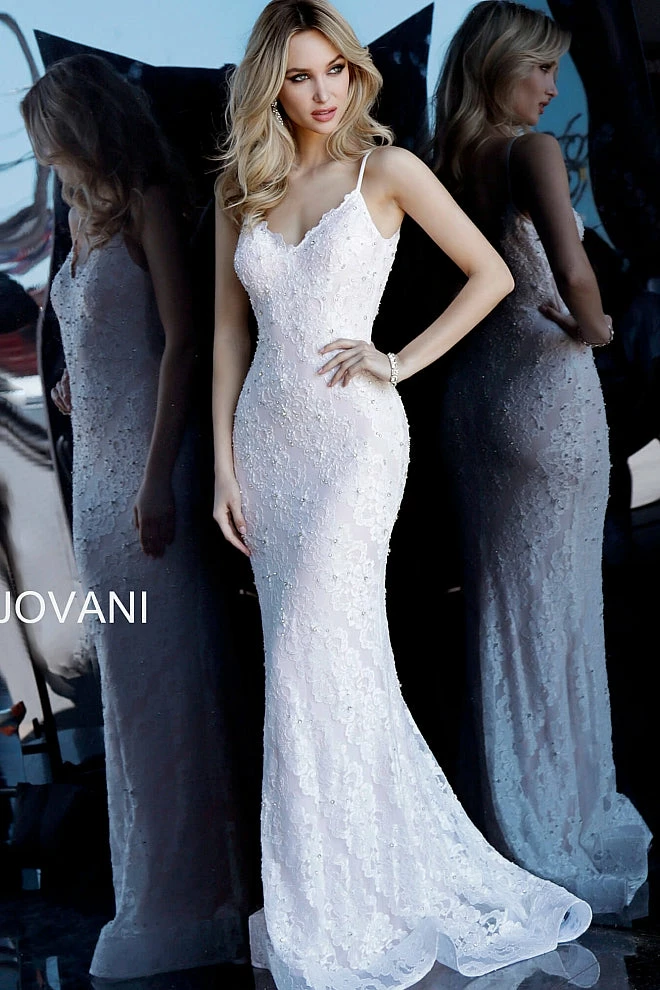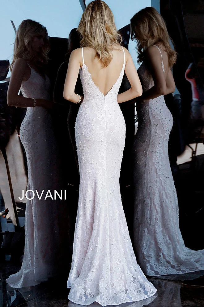 Jovani 68408 white/blushΒ V Neck EmbellishedΒ lace Fitted Prom Dress Evening Gown 68408