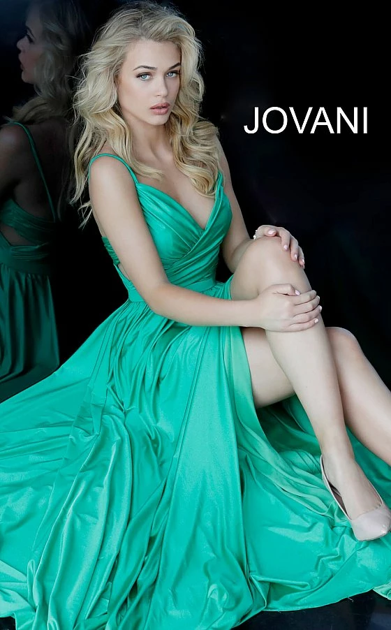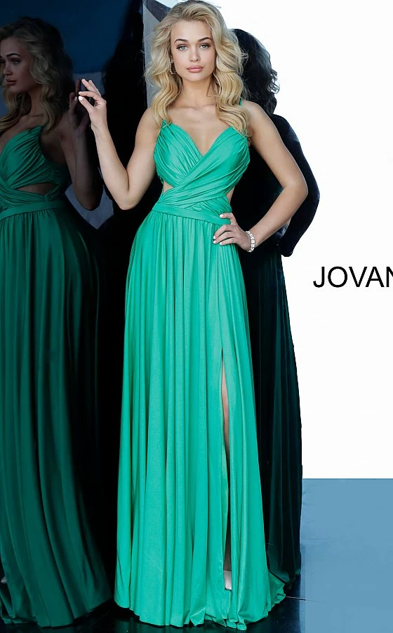 Jovani 68642 spaghetti straps sweetheart neckline ruched bodice flowy prom dress evening gown bridesmaids dress pageant gown Ruched Prom Dress with a v-neckline, spaghetti straps bodice with cut-outs and low back with zipper closure, floor-length pleated skirt with side high slit.