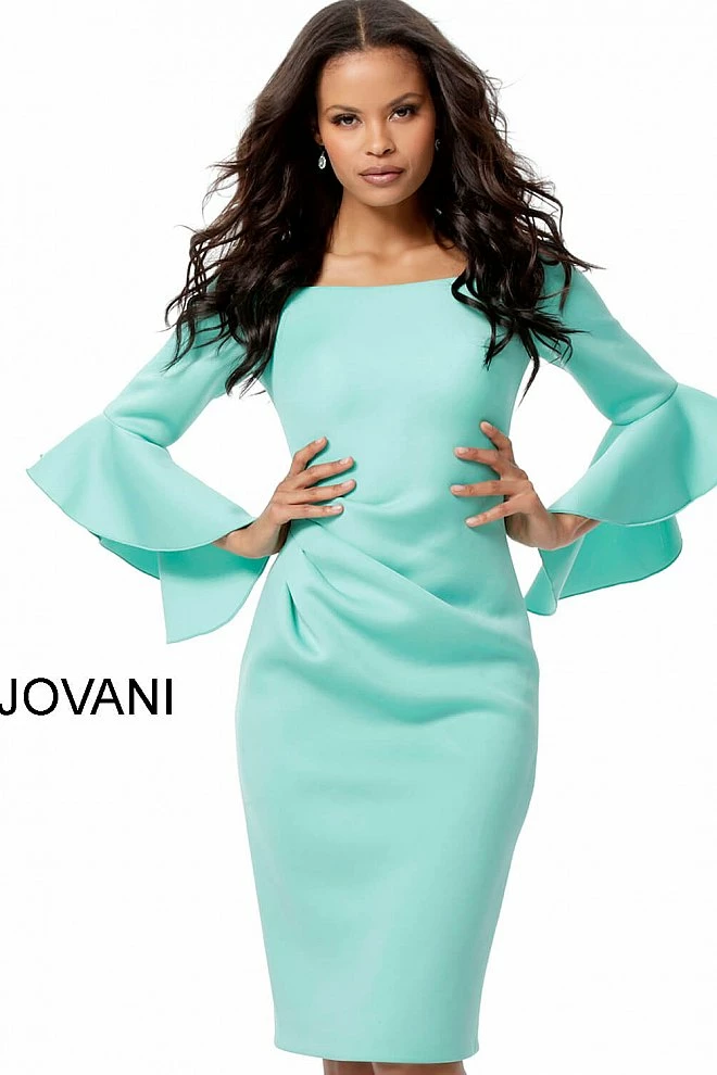 - Details: Stretch scuba fabric, fitted, knee length dress, ruching at waist, three quarter length bell sleeves, off the shoulder boat neckline.