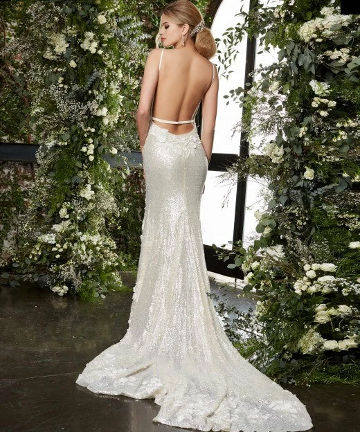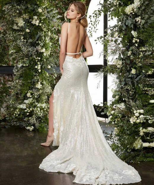 Jovani Bridal JB03592 cream bridal gown features a slim silhouette with a deep plunging neckline, spaghetti straps and a single-strap open back. Three-dimensional floral appliques embellish this sequin wedding dress, finished with a thigh-high slit and a chapel train. Sequin Floral Lace Backless Wedding Dress Slit Train Fitted