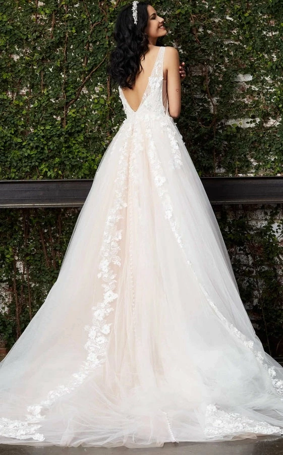 Jovani Bridal JB05353 Off White Blush Floral Appliques Bridal Ballgown A Line 3d Floral wedding dress This Jovani Fate Bridal JB05353 A-line wedding gown is fashioned in layers of soft net, detailed with a V-neckline, sheer plunging sides, and an open V-back. Three-dimensional floral appliques stretch down the length of this sleeveless bridal ballgown, finished with covered back buttons that extend to the chapel train.