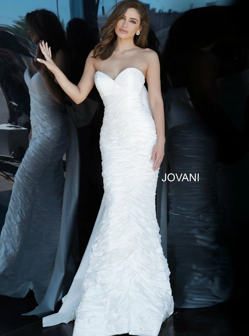 Jovani 02035 sweetheart neckline mermaid bridal gown with delicate ruching and large bow in the back that flows past the sweeping train. Â