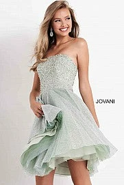 Jovani Kids K04445 This is a short strapless cocktail dress for girls and preteens. It is strapless and has a straight neckline. The bodice is embellished and the skirt is shimmer.