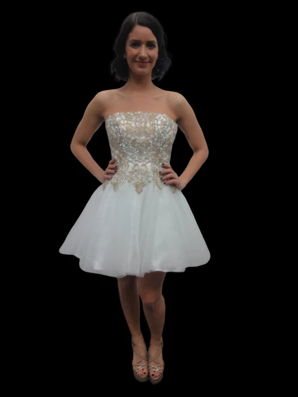 - Details: Tulle fit and flare short girls dress, fully lined, strapless embellished bodice, straight neckline.Â