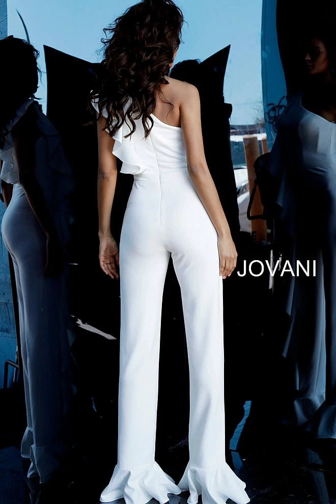 Jovani 67840Â Off White One Shoulder Ruffle Evening Jumpsuit 67840