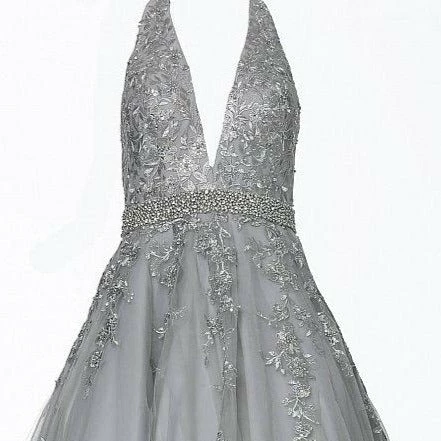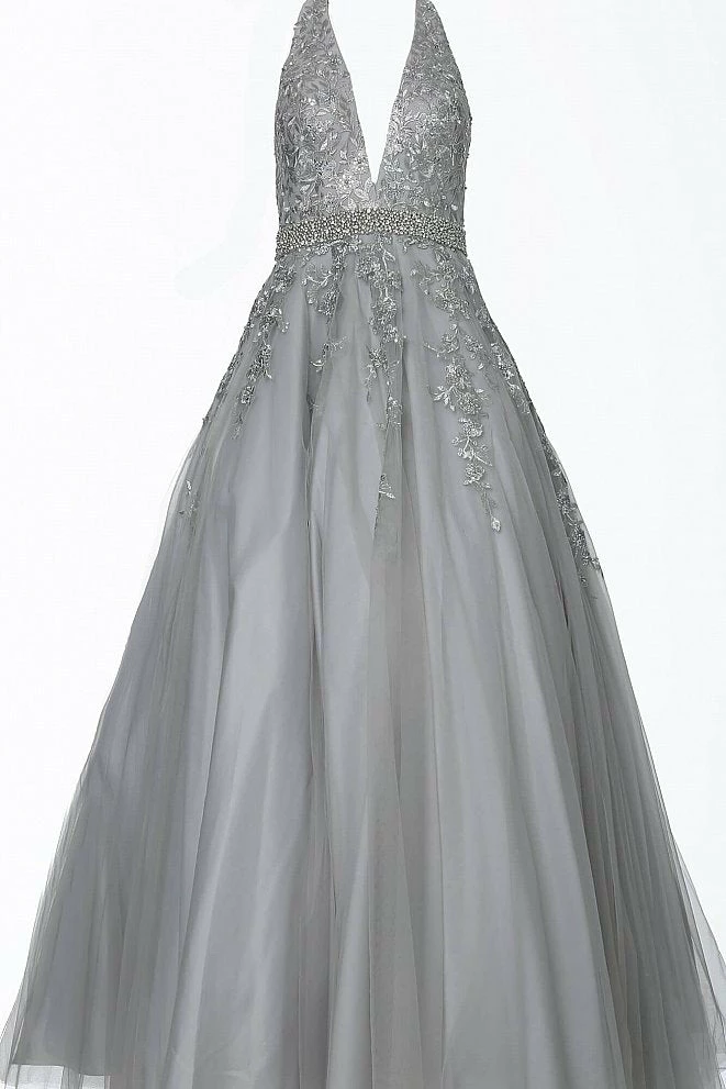 - Details: Floral embroidered tulle prom ballgown, floor length full skirt, crystal embellished belt at waist, sleeveless bodice with halter plunging neckline, half back.