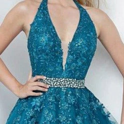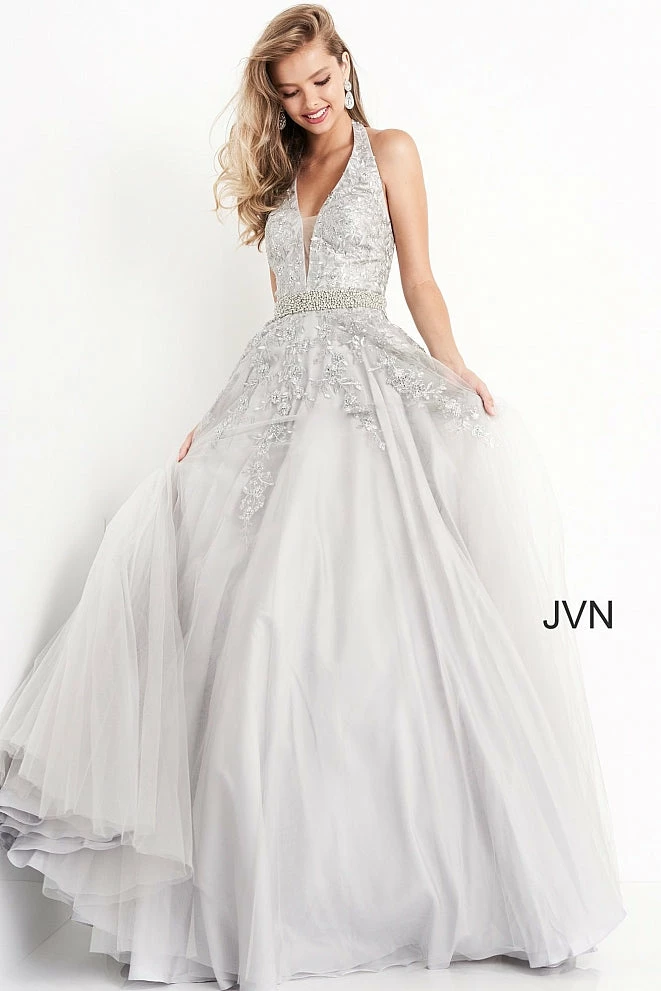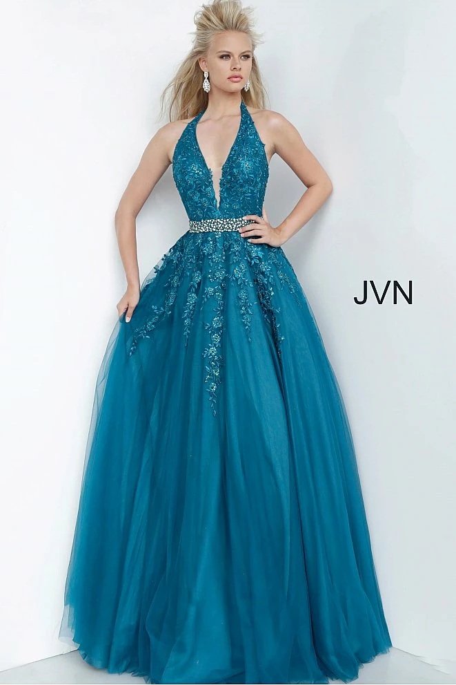 Jovani JVN00923 Long tulle A Line Prom Dress Ballgown. Plunging Deep V Neckline with a floral Lace embroidered bodice with embellishments cascading into the lush A Line skirt. Crystal rhinestone waist belt. Halter Neckline. JVN by Jovani Prom Dress, Pageant Gown, Evening Gown.