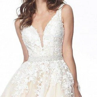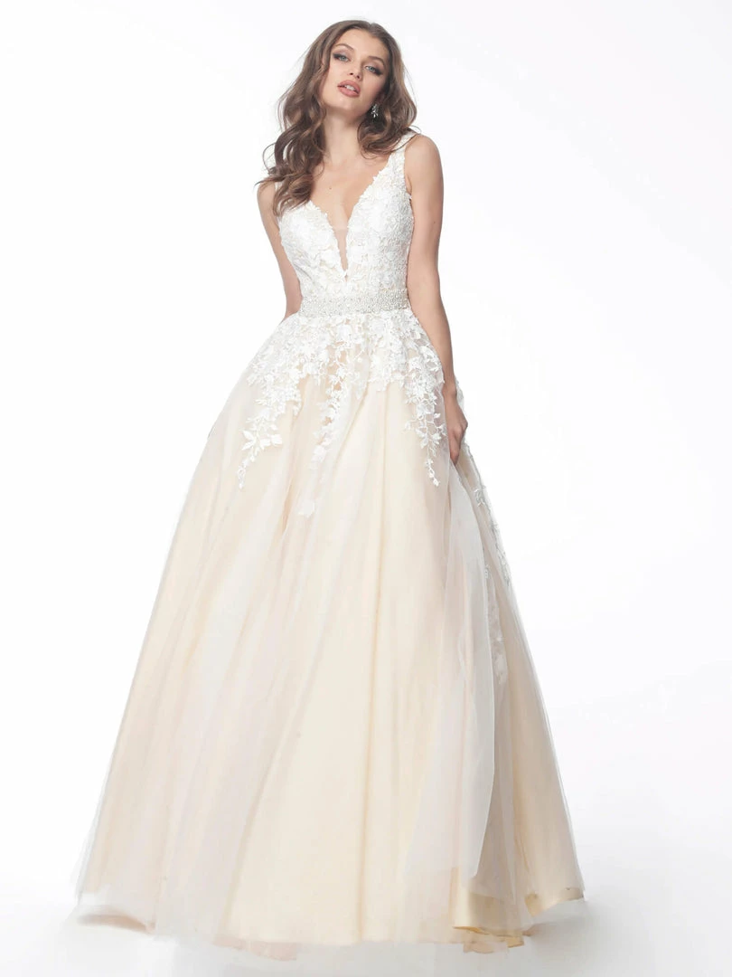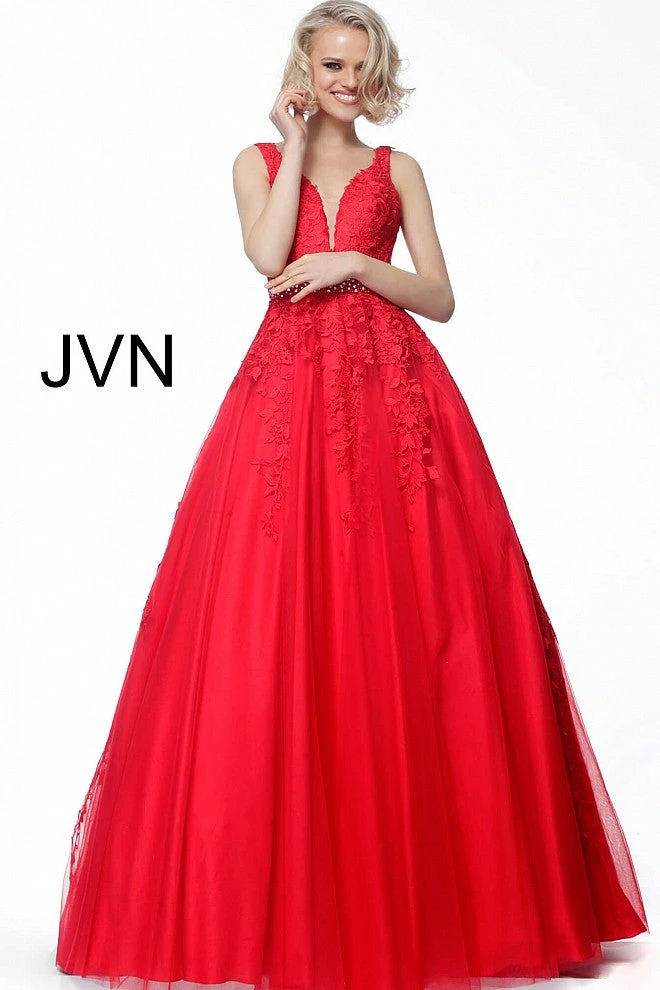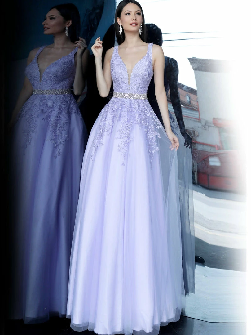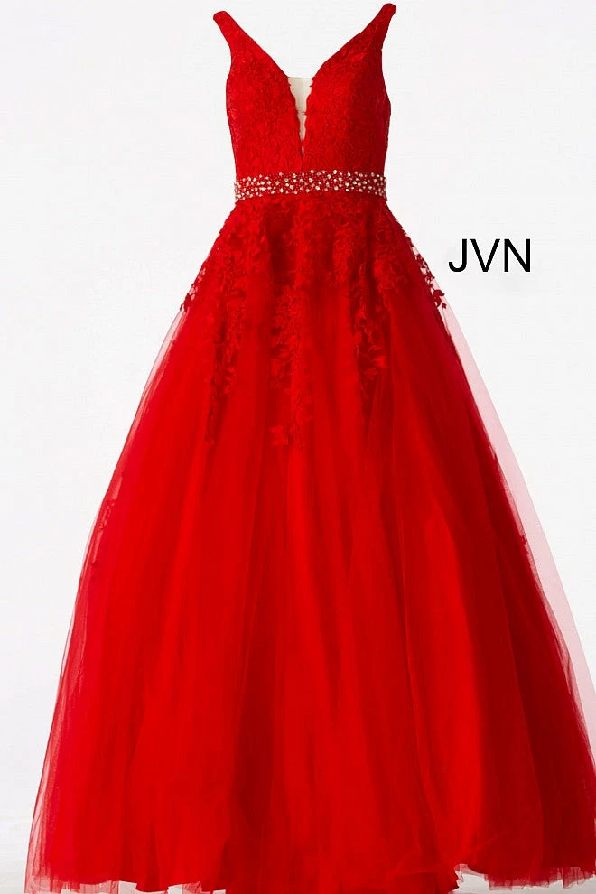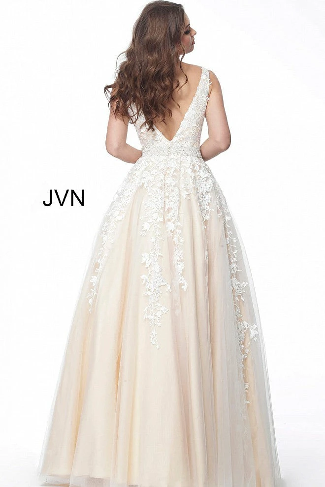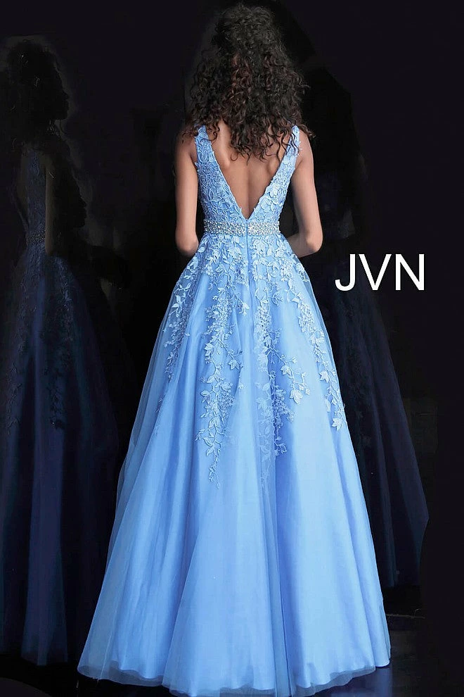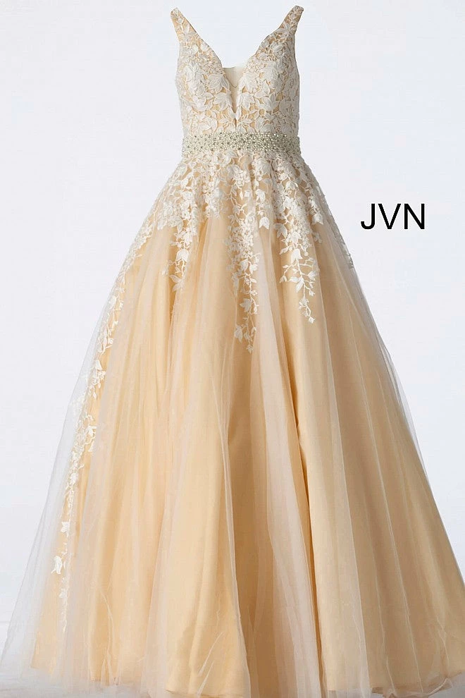Jovani JVN68258 tulle embellished embroidered A line long prom dress ball gown informal wedding dress evening gown Floral embroidered tulle, embellished belt at waist, A line floor length skirt, fitted sleeveless bodice, plunging neckline with sheer mesh insert, V back.