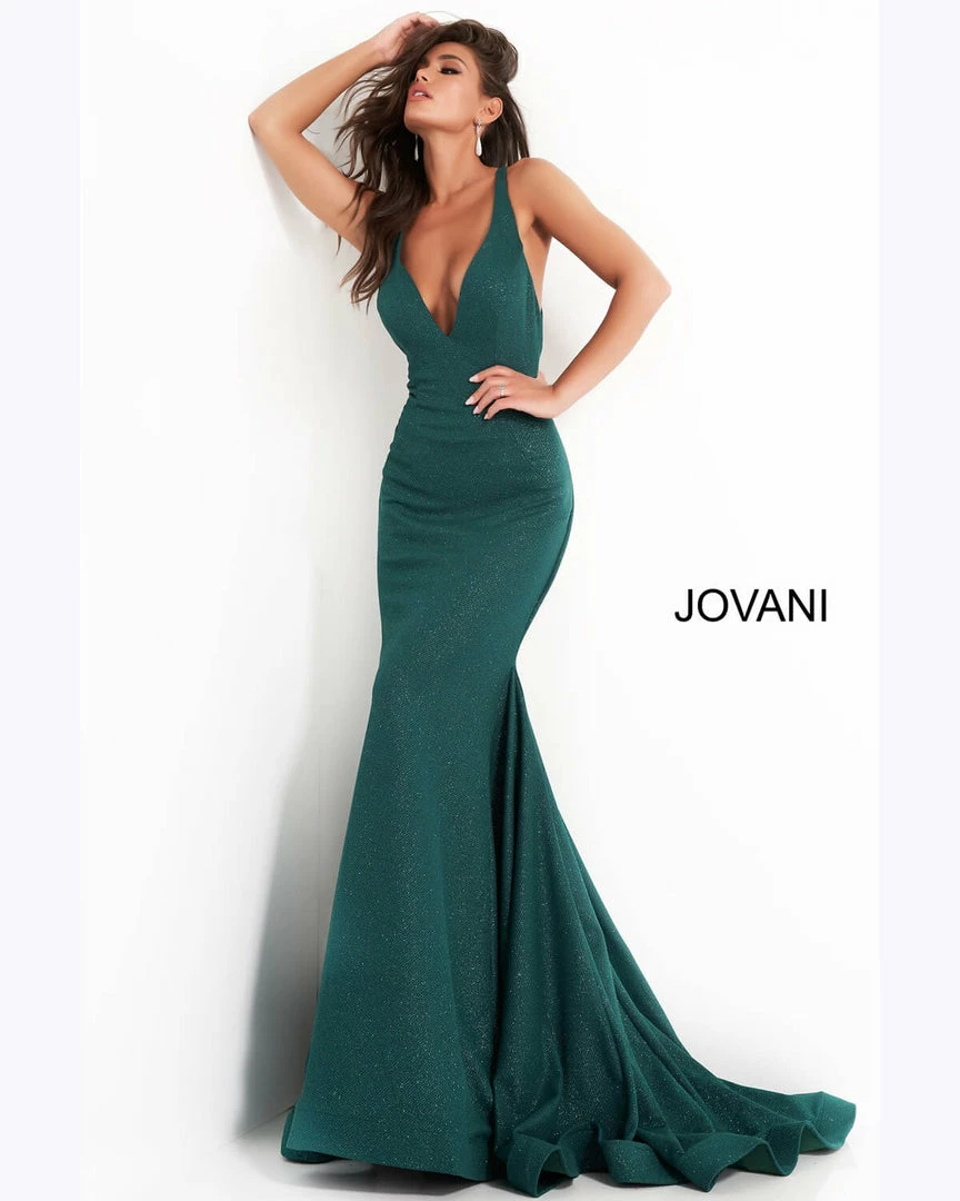 Jovani JVN00698 Stretch Glitter V Neck Mermaid Prom Dress Backless Train GownÂ