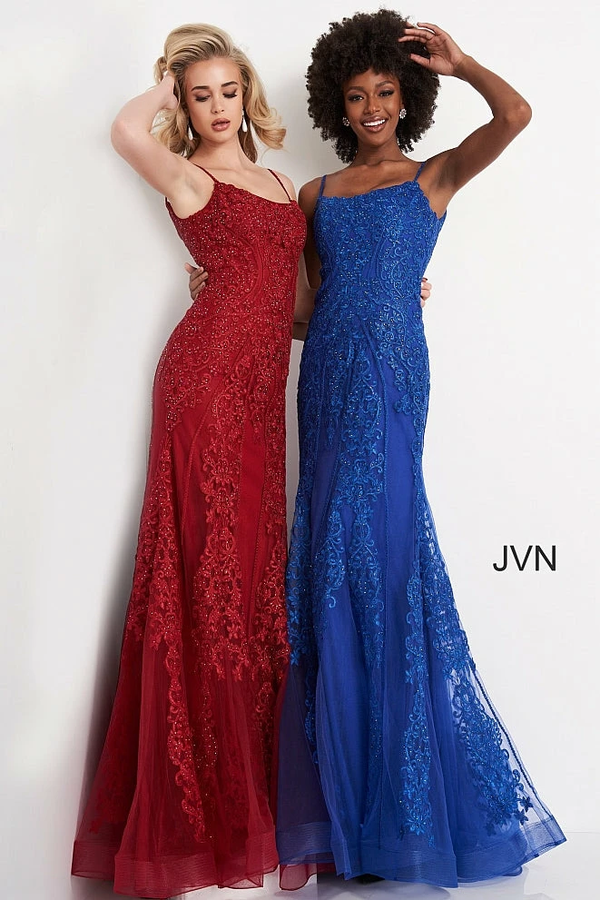 Jovani JVN02012 is a long Fitted embroidered lace Prom Dress featuring a modest neckline with spaghetti straps. Corset back ensures a perfect fit & a touch of class. Embroidered lace cascades down the bodice or the dress into the tulle edge skirt. Lace up corset back. JVN 02012