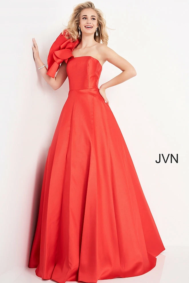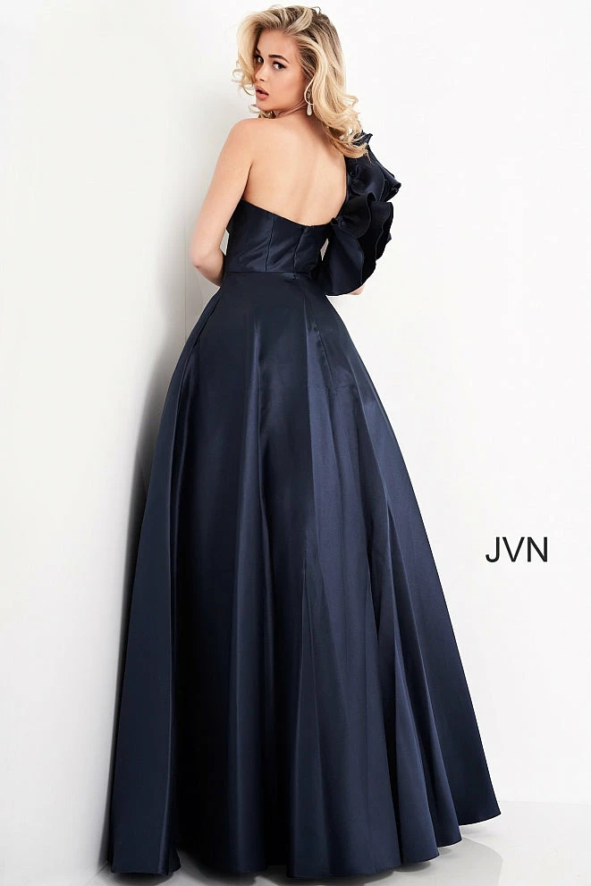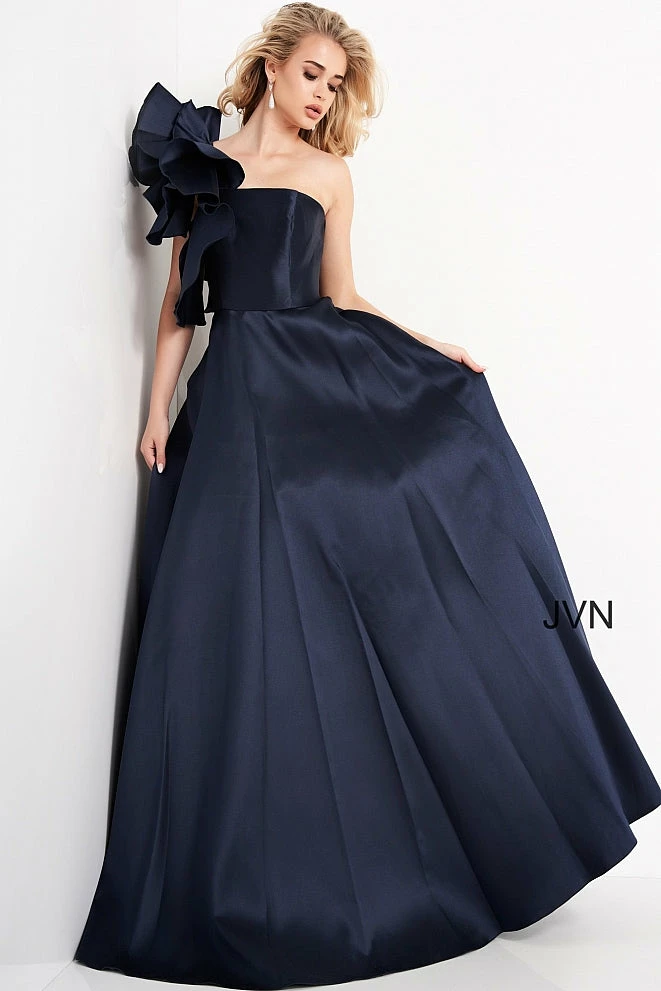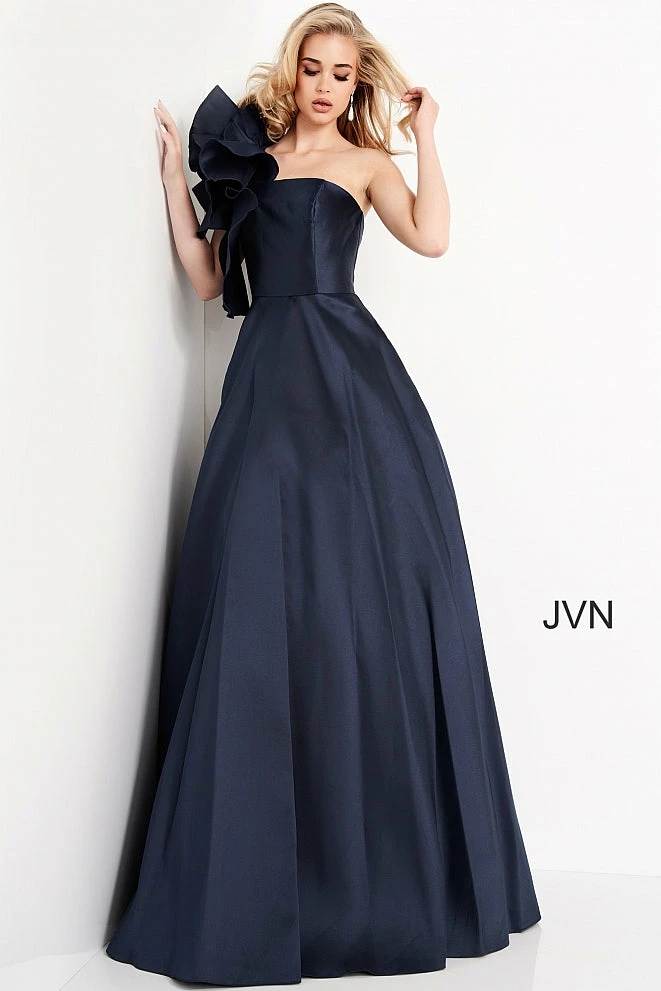 Jovani JVN03143 Tube top straight neckline with large ruffle one shoulder detail on a full mikado long skirt prom dress evening gown pageant dress
