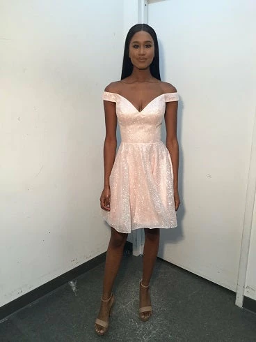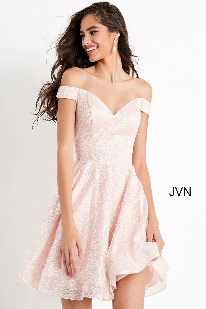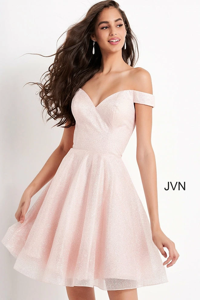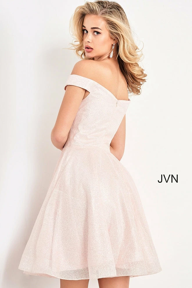 Jovani JVN04639 Short Shimmering Fit & Flare Formal Cocktail dress with off the shoulder straps. sweetheart neckline. Great formal evening gown for a classic cinderella look! JVN 04639