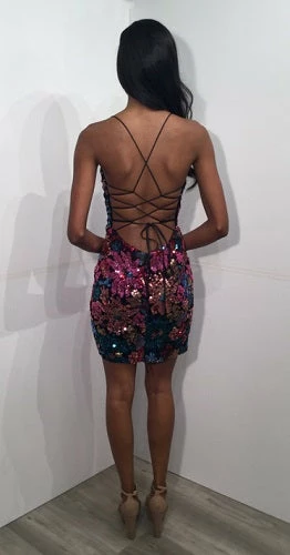 Jovani JVN05736 is a Short Fitted Sequin embellished Formal cocktail dress. V neckline with an open back and a spaghetti straps lace up tie corset style closure. Great versatile style for any formal event. JVN 05736