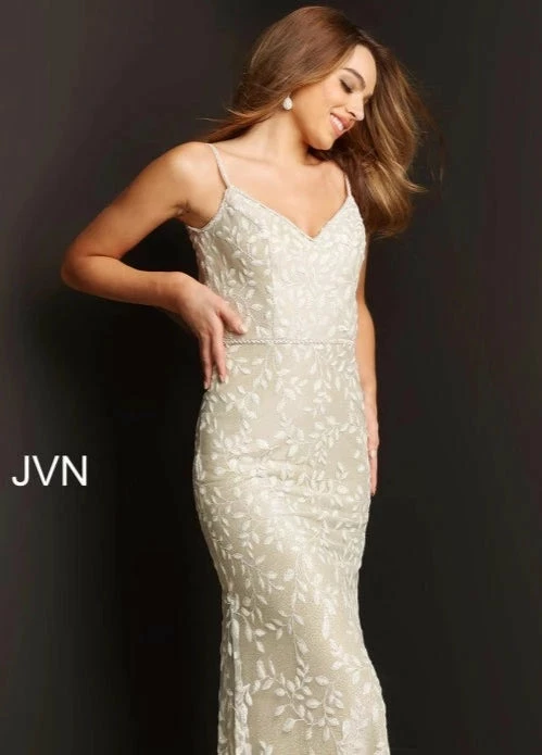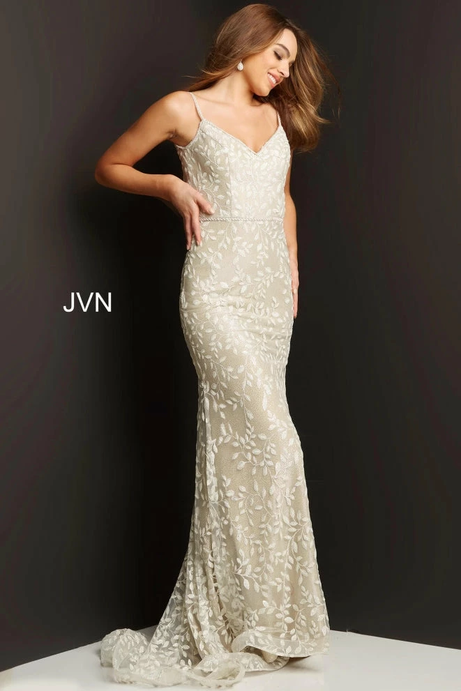 Jovani JVN06472 long champagne embroidered lace v neckline prom dress with sweeping train beautiful leaf pattern with low scoop back twisted rope style trim at the neckline and waist. Prom Dress, Pageant Gown, Evening Gown, Informal Wedding Dress.Â