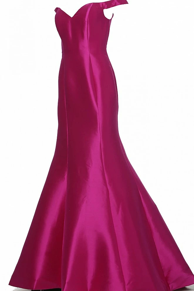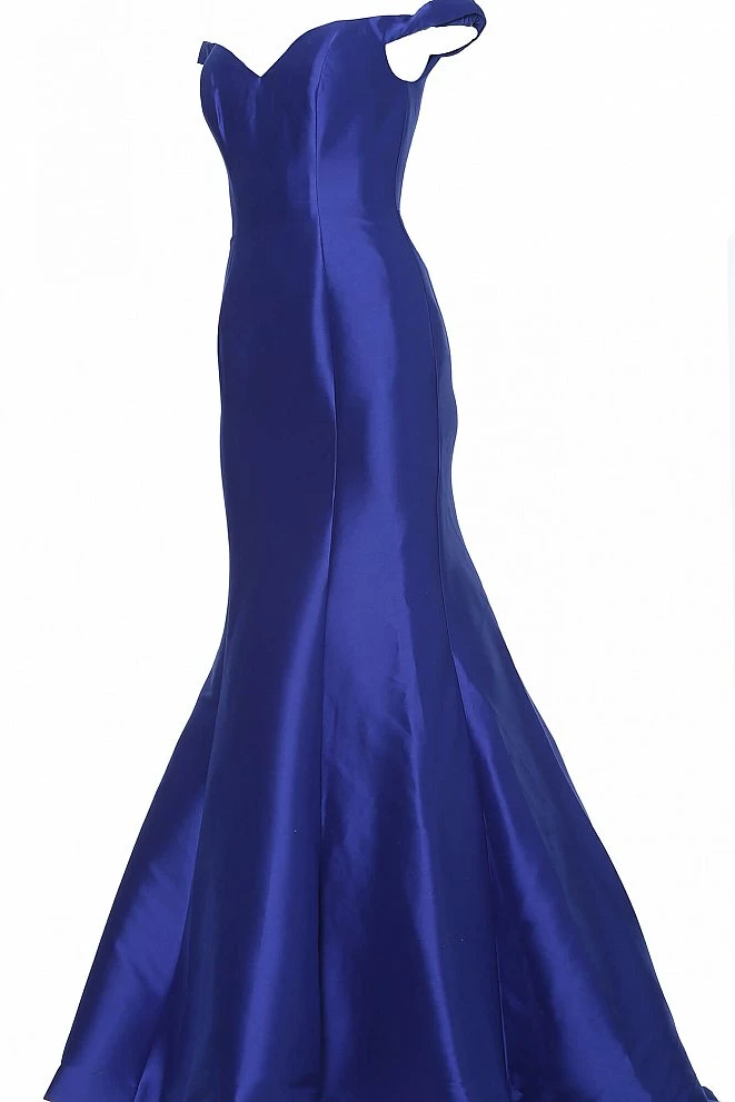 - Details:Â Mikado prom dress, floor length, form fitting silhouette with mermaid bottom, off the shoulder bodice, sweetheart neckline.