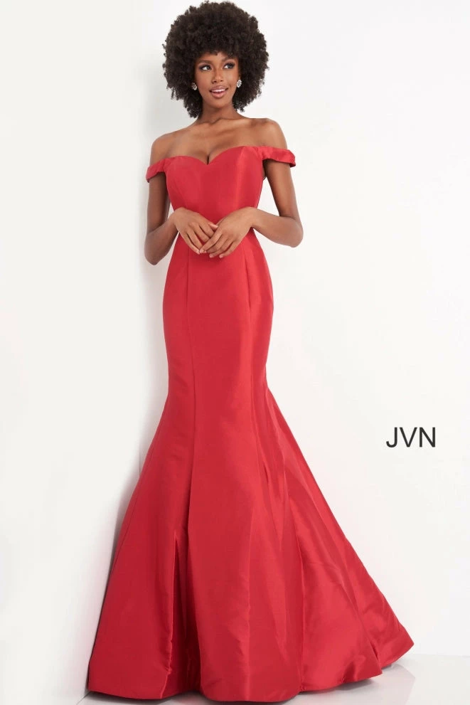 Jovani JVN3245 is a Long floor length fitted Prom Dress. Featuring a full mermaid silhouette with a slight train and lush bottom. Off the shoulder straps with a subtle v neckline. Beautiful Evening Gown! Pageant Formal Dress. Long Fitted Off the Shoulder Prom Dress Mermaid Pageant Gown JVN3245