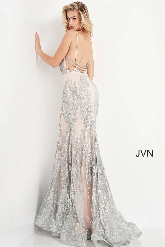 Jovani JVN3663 is a long Form Fitting Mermaid silhouette prom dress, Pageant gown & evening formal wear. Featuring a plunging neckline with crystal embellishments along the straps, edges of bodice & waist belt. Open back with crystal embellished straps. Full mermaid flare skirt. JVN3663
