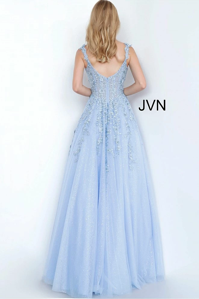 - Details: Floral embroidered glitter prom ballgown, full floor length skirt, fitted sheer bodice with boning, illusion V neck, straps over shoulders, open back.