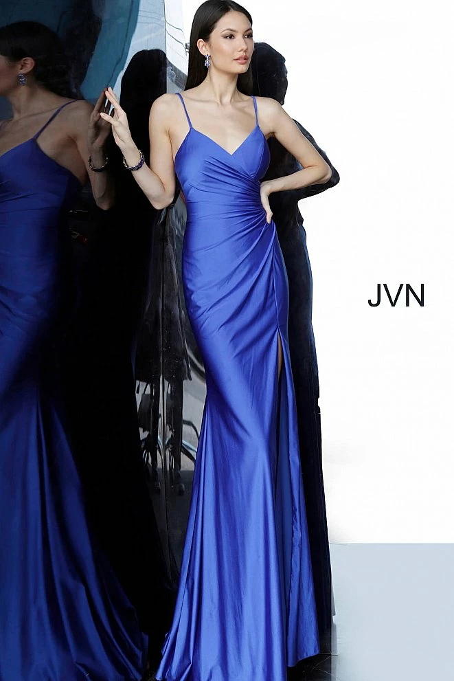 Jovani JVN66714 Ruched bodice v neckline satin fitted long prom dress evening gown with a side slit