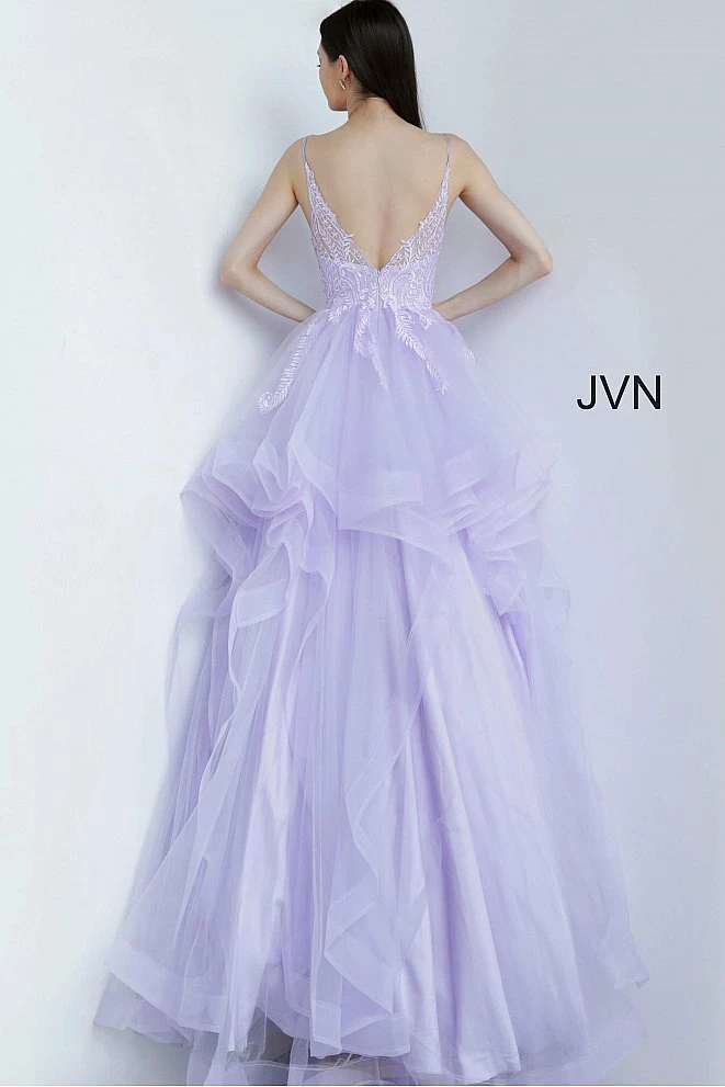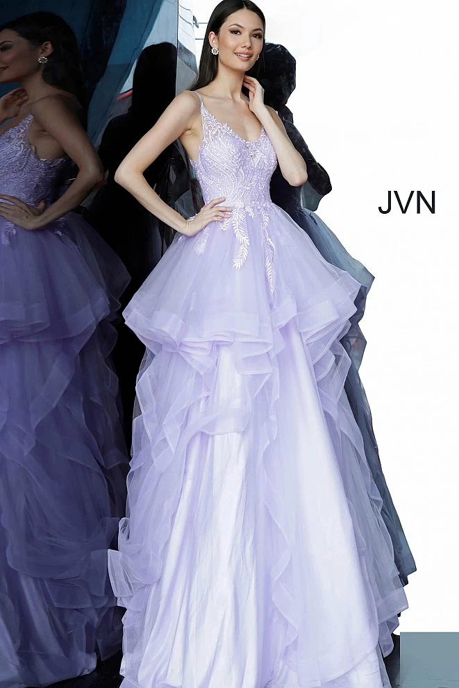 Jovani JVN68128 is a long ruffle Prom Dress featuring a lovely Embellished Lace Applique Bodice with Sheer Illusion Lace Straps and v neckline with a sweetheart under design. Open V Back. This full ballgown features a beautiful layered tulle ruffle with embellished appliques cascading from the bodice. Very Fun & Beautiful design. JVN 68128