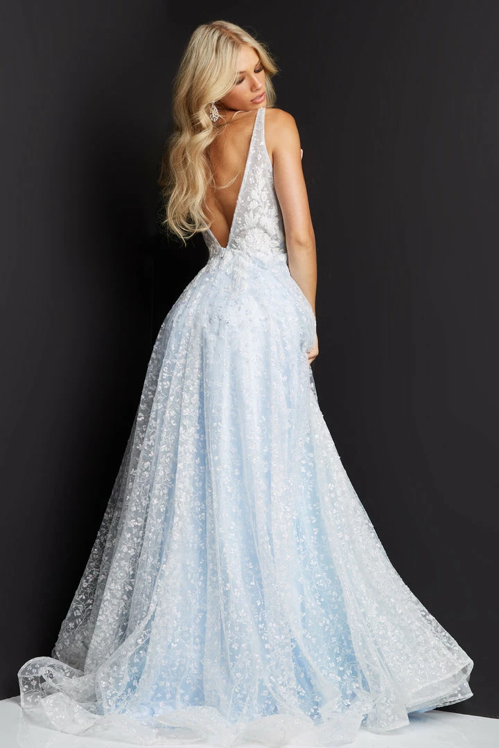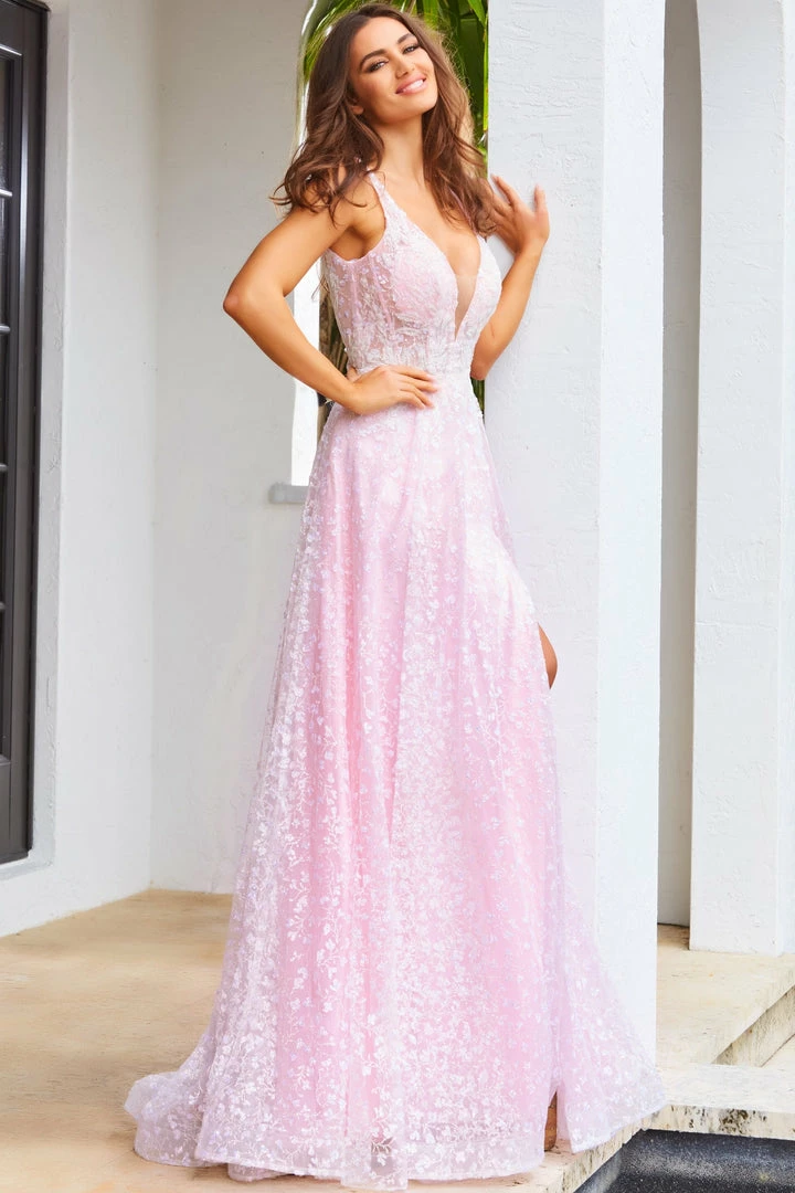 JVN08421 This JVN by Jovani prom dress is covered in floral lace with sequin embellishments to add sparkle. The evening gown is an A line with a train and features a plunging V neckline with sheer mesh insert. It has a low V back and a high side slit.Â