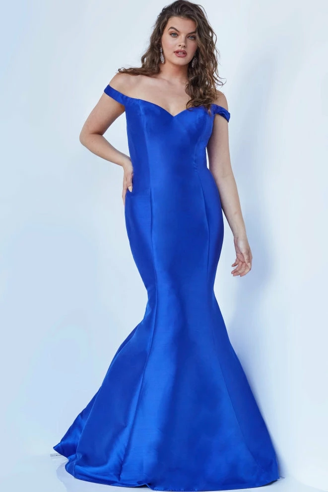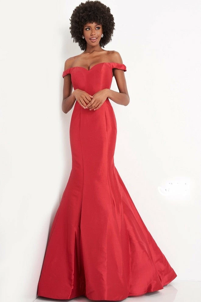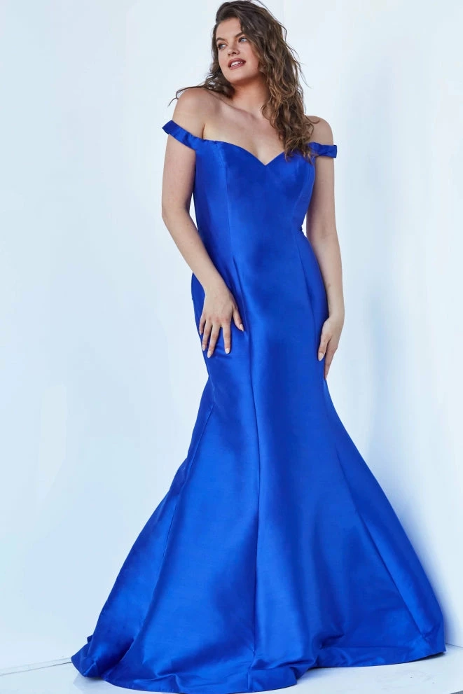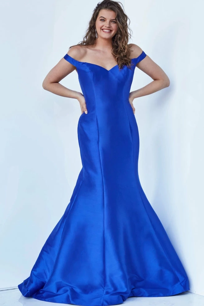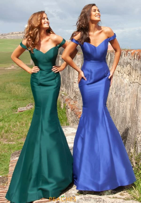 JVN by Jovani JVN3245 is an off the shoulder Long Mermaid Prom Dress with Off the Shoulder straps Evening gown formal pageant dress JVN3245Â Â Mikado prom dress, floor length, form fitting silhouette with mermaid bottom, off the shoulder bodice, sweetheart neckline.