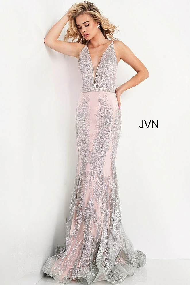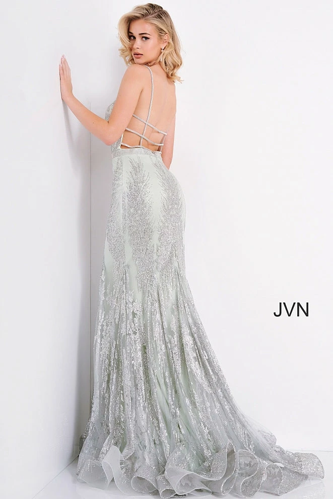 Jovani JVN 3663 is a long Form Fitting Mermaid silhouette prom dress, Pageant gown & evening formal wear. Featuring a plunging neckline with crystal embellishments along the straps, edges of bodice & waist belt. Open back with crystal embellished straps. Full mermaid flare skirt.