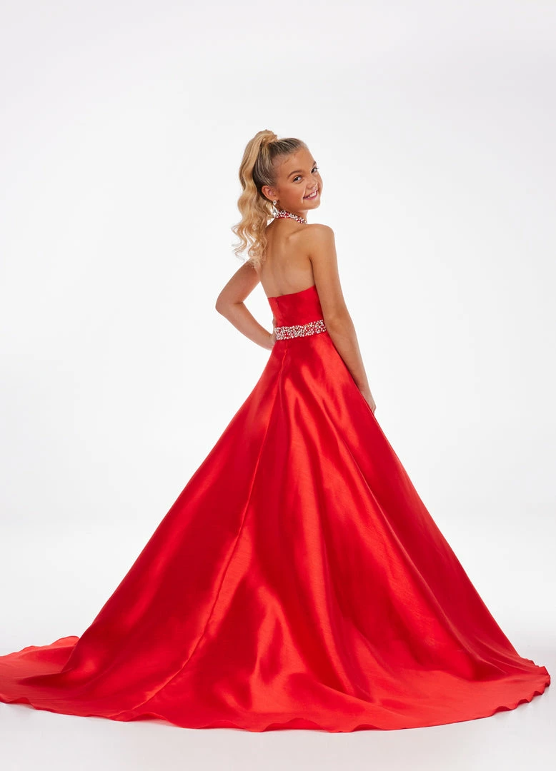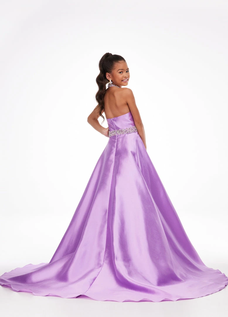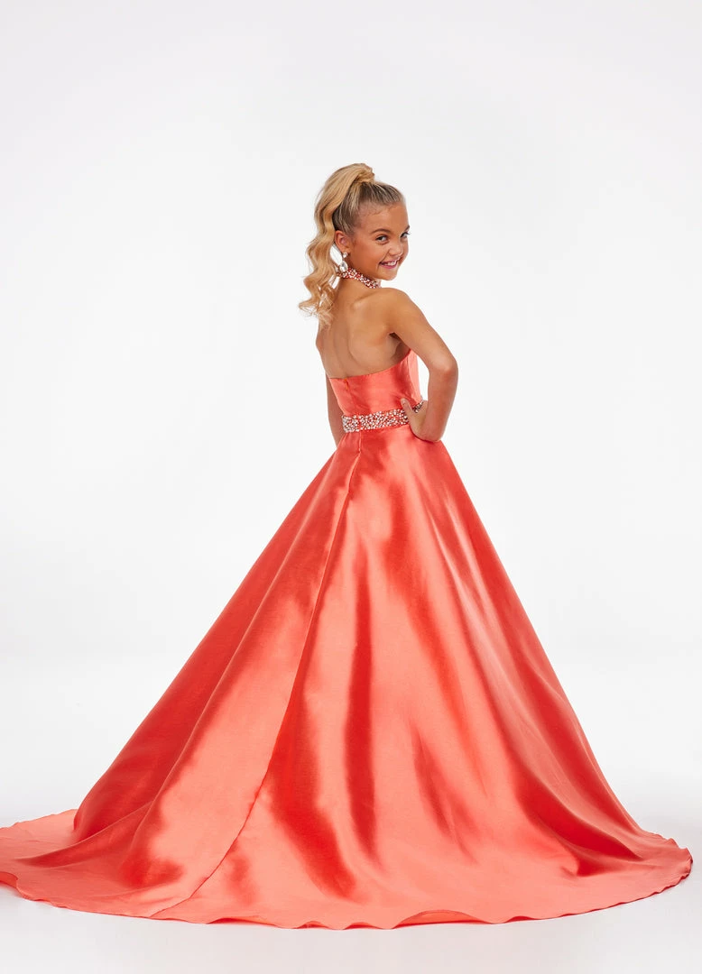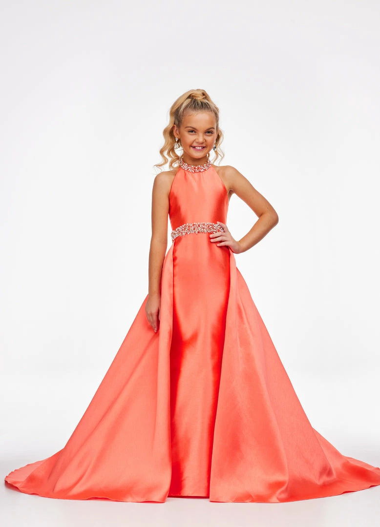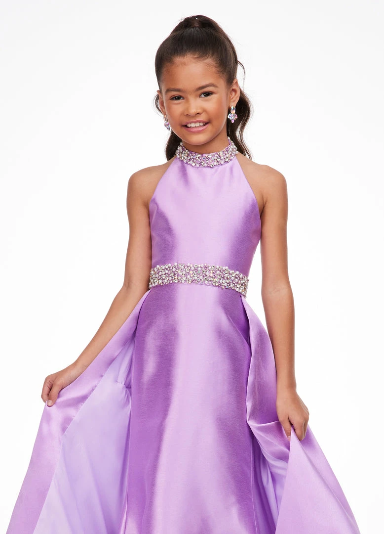Ashley Lauren Kids 8108 Long Halter Pageant Dress with overskirt dress Bring the drama in the halter mikado gown featuring a pearl and crystal encrusted neckline and waist. The fitted skirt is accented with a full overskirt and finished with a train.