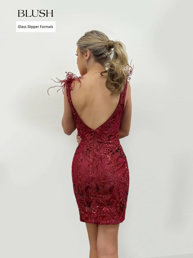 Blush Prom 20411 is a Short Fitted shimmer Cocktail Formal Dress with a V neckline. Embroidered Lace with sequin embellishments. Feather accented shoulder straps. Stunning & Classy Formal Dress for any event!