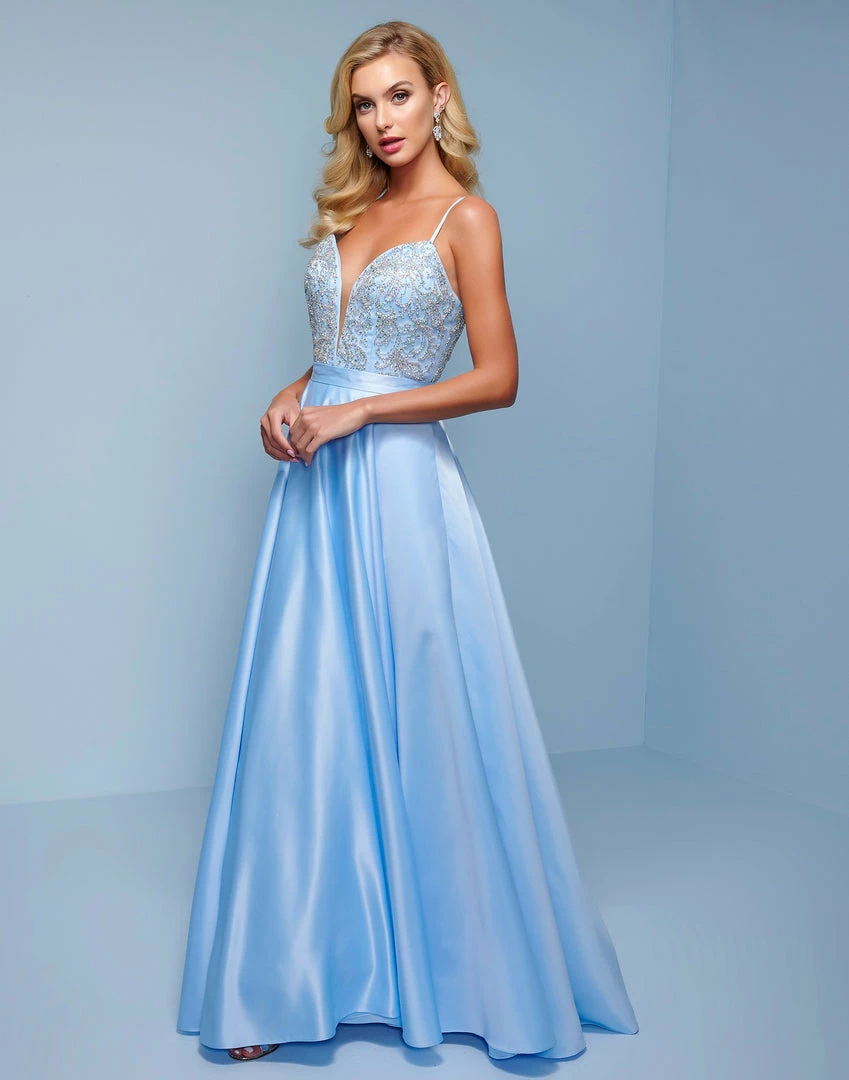 Splash Prom K549 This is a long satin prom dress, pageant gown and formal evening dress with a plunging v neckline and sheer panel. The bodice is embellished with spaghetti straps and the back is a modest half back.Â