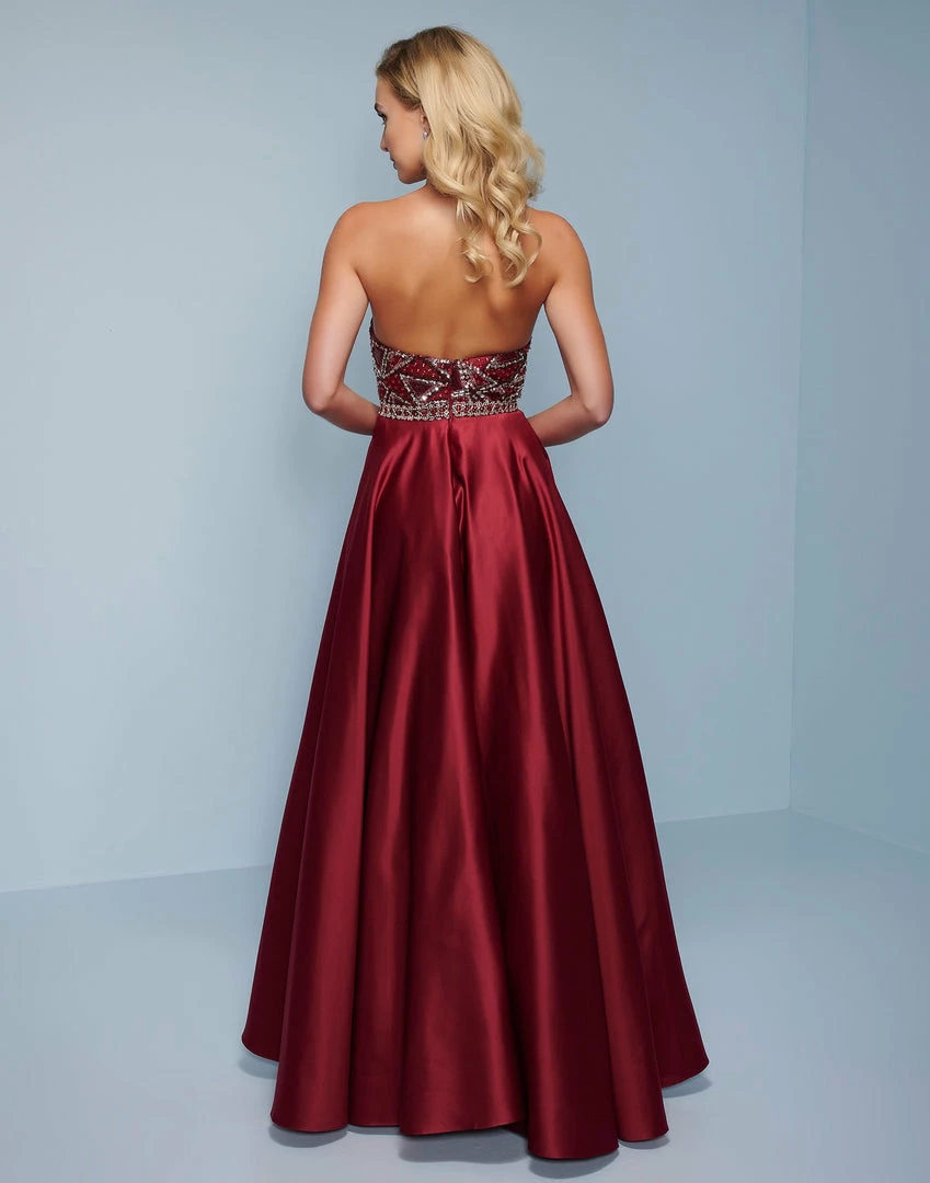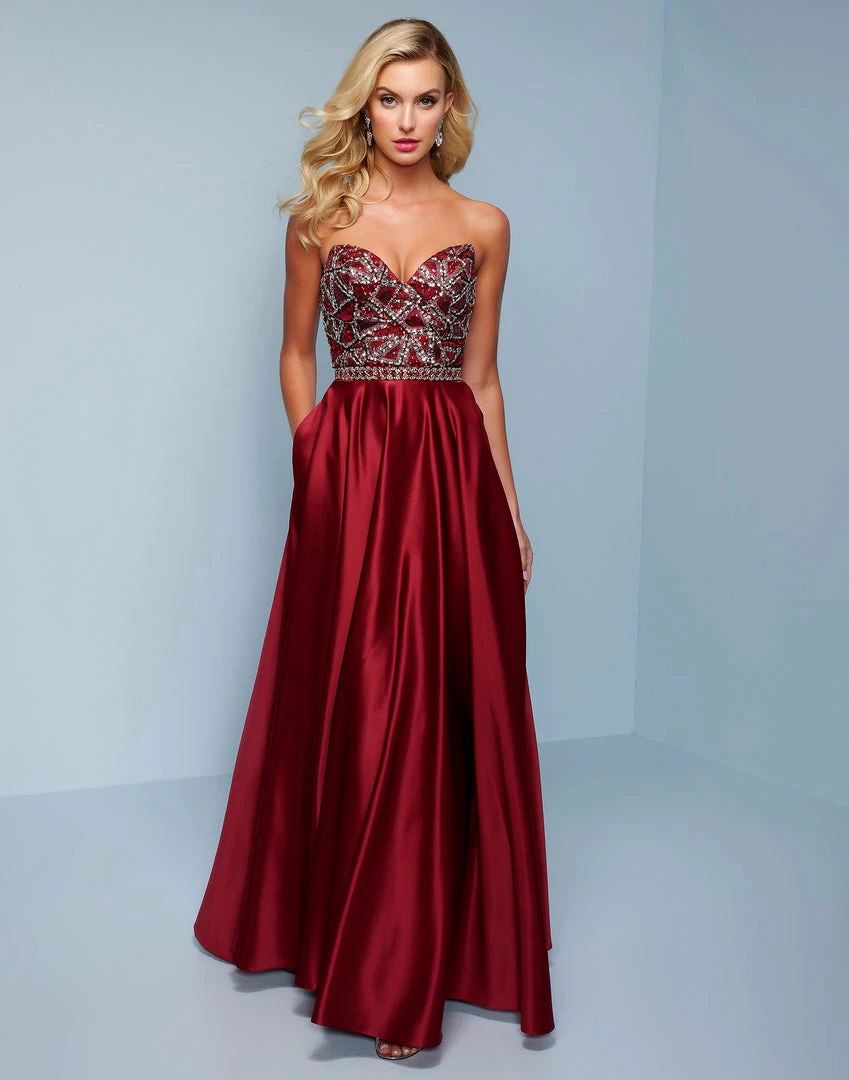 Splash Prom K555 This is a strapless sweetheart A line satin prom dress, pageant gown and formal evening gown with an embellished bodice.