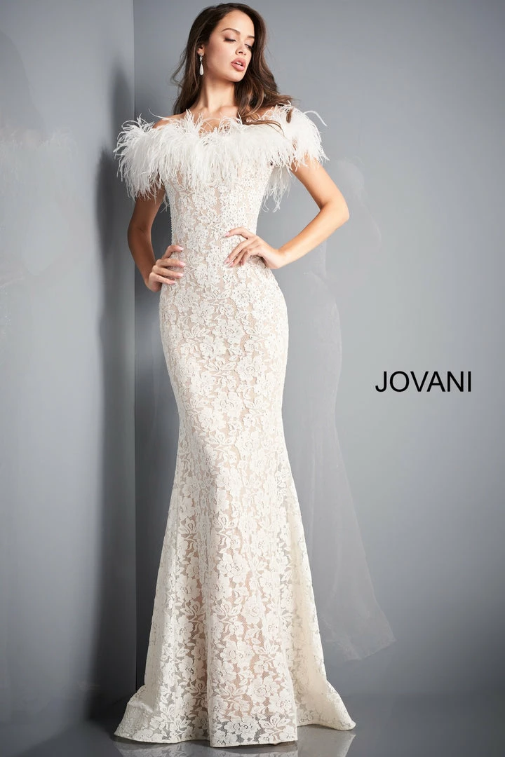 Jovani 06451 is a stunning long fitted lace formal evening gown. Lush Feather accented off the shoulder sleeves. Fit & Flare silhouette with a lush sweeping train with horse hair trim. Fully embellished with scattered crystal rhinestones. sweeping train. Wedding reception dress. prom dress. pageant gown.