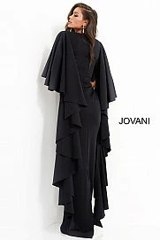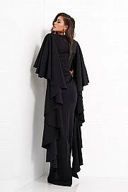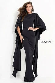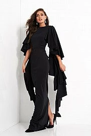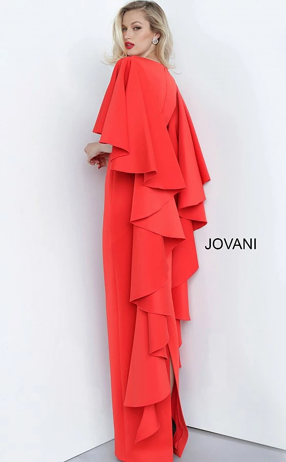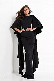 Jovani 3018 Scuba evening dress featuring a long ruffle sleeves bodice, crew neckline and a closed back with zipper closure. Floor-length bodycon skirt. Formal Evening Wear Dress