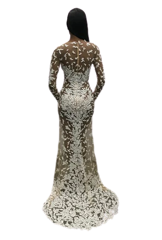 Jovani Couture S59005 is a long Sheer Fitted Gown Featuring Long Sleeves and a Plunging Neckline with a mesh insert. Stunning Hand Beading and Floral Applique cover the bodice and disperses as it cascades into the sheer shirt with a sweeping train. The Ultimate Sexy Red Carpet Gown! 59005