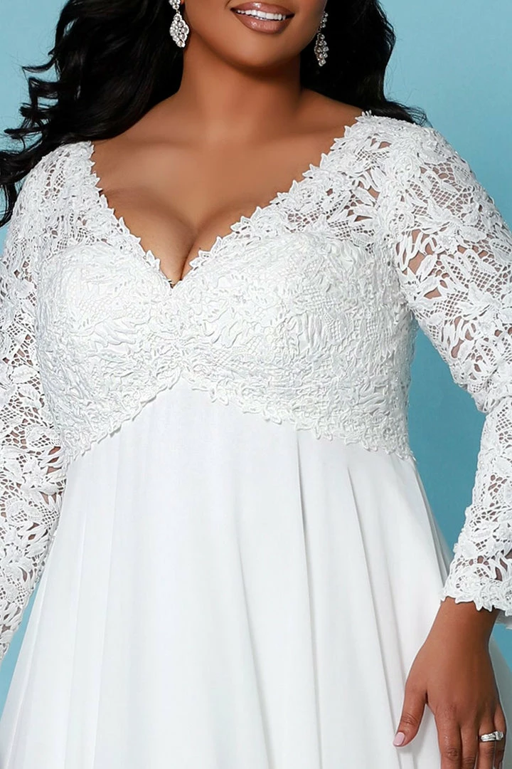 Brides tying the knot again fall in love with this Empire wedding dress designed with ultra feminine lace on the bodice and long sleeves. Soft, flowing chiffon skirt with a sweep train gracefully floats down the aisle. The higher waistline flatters any figure and creates a fit that lets you feel comfortable from the start of the ceremony to the last dance.