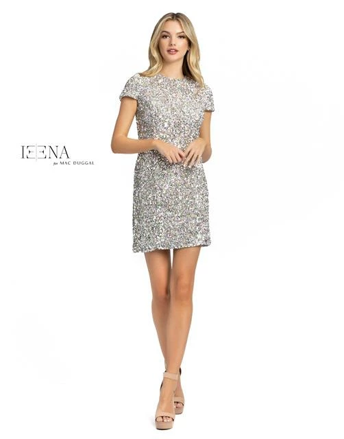 Mac Duggal 26300 Silver Cocktail Dress Ieena You will look amazing in this short sleeves cocktail dress. It is fitted and short and fully sequined. The neckline on this evening cocktail dress is high crew.Â