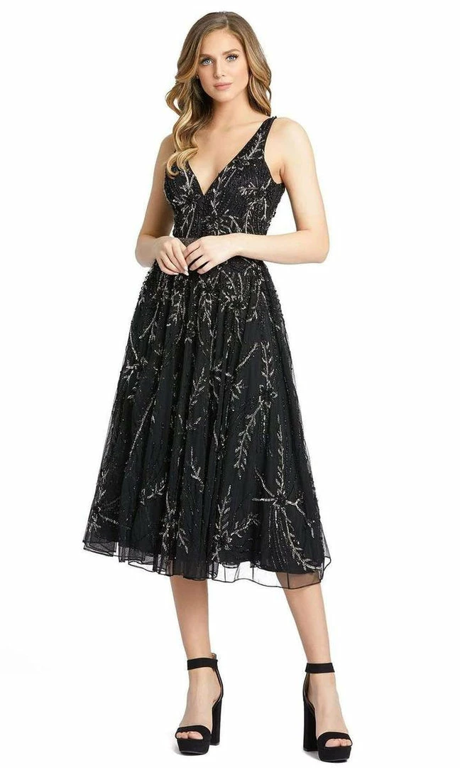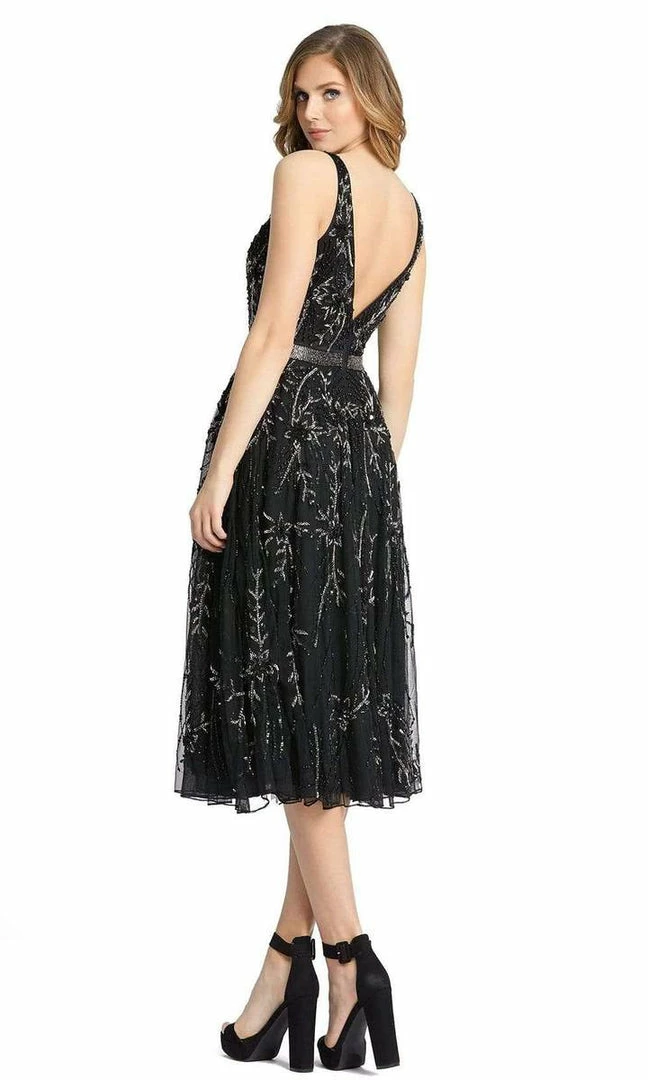 Mac Duggal 5320 is gorgeous knee length formal cocktail dress. adorned with sequin & beaded embellishments along the Aline silhouette and V neckline. Open V Back. Liquid beaded waistline.