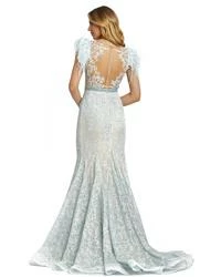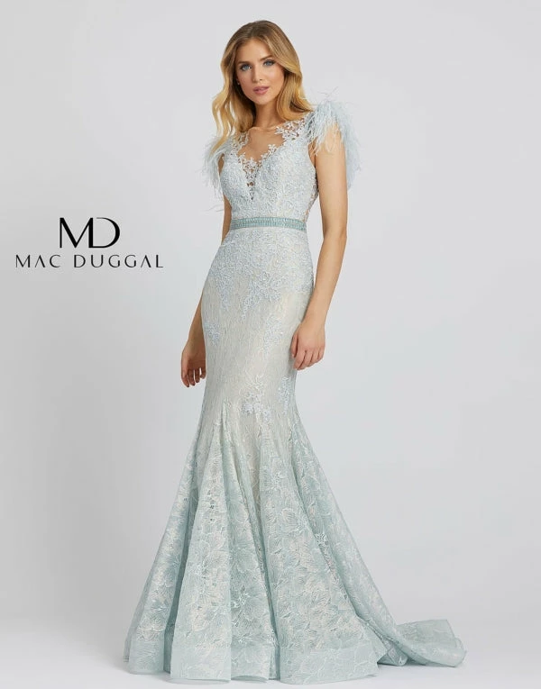 Mac Duggal 79230 – 79230 is a Stunning Shimmering metallic lace fit & Flare mermaid silhouette with a lush trumpet skirt with horse hair trim and a sweeping train. sheer lace embellished neckline with feather accents along the cap sleeve. Formal gown with feathers delicately hand sewn on the outer banks of the cap sleeves, iridescent nude lining, fused with diamante stones and matching belt Prom, Pageant & Formal Evening wear. Backless cut out