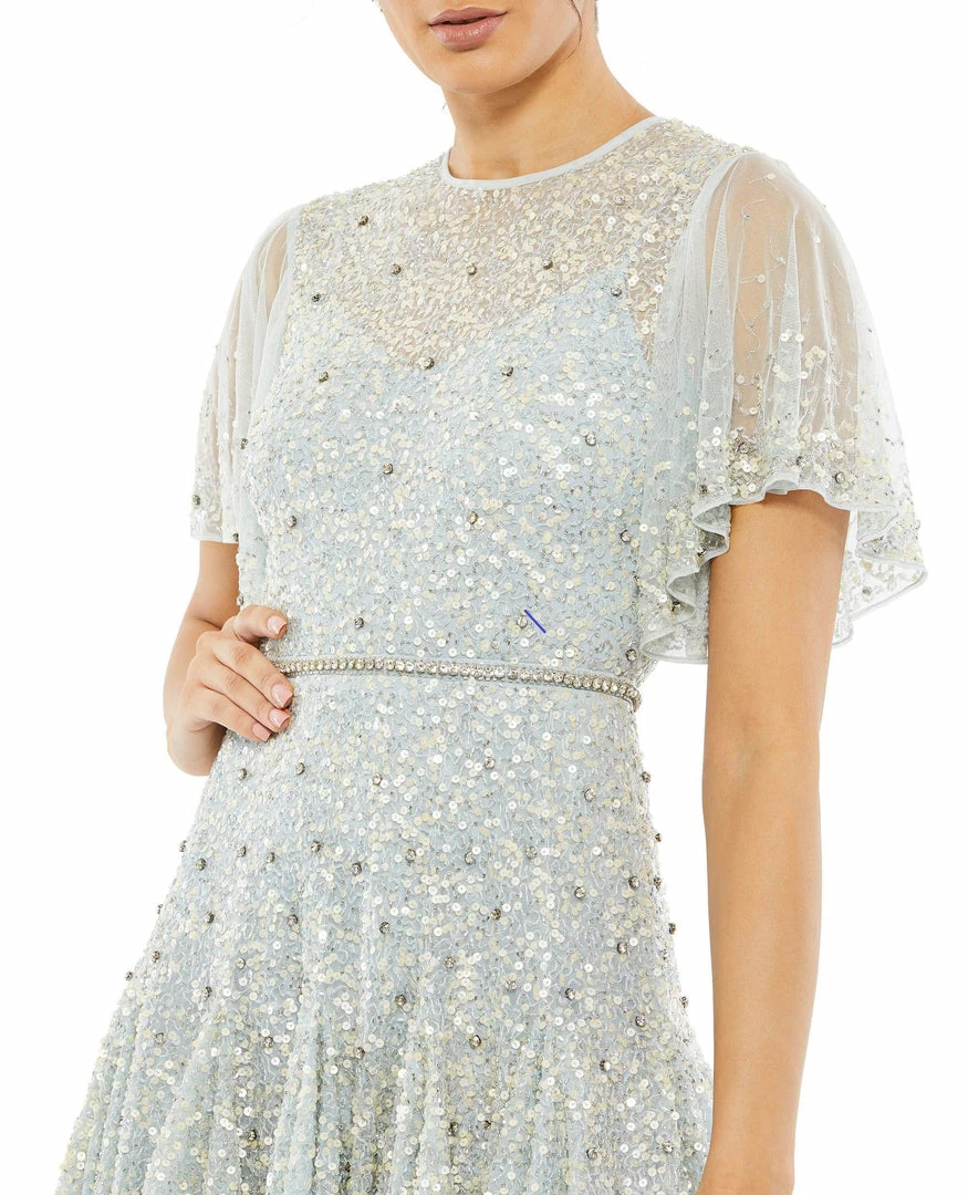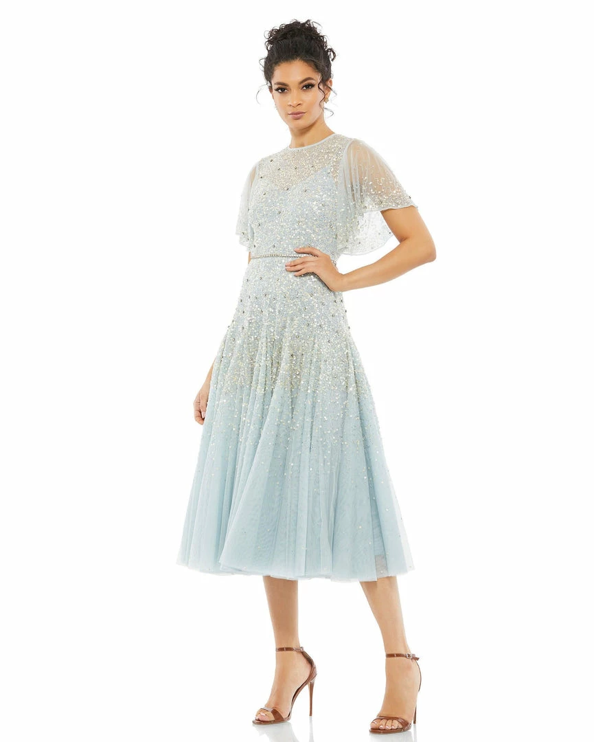 Mac Duggal 93655 Tea Length Formal Sheer Embellished Prom Dress Short sleeve Gown
